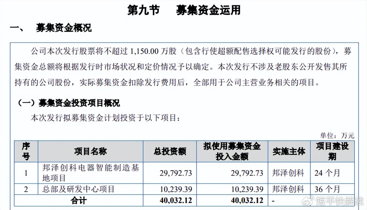 据短平快解读了解,本次IPO,邦泽创科拟公开发行不超过1,150.00万股,拟募集资金40,032.12万元,用于邦泽创科电器智能制造基地项目、总部及研发中心项目,拟投入募集资金分别为29,792.73万元、10,239.39万元。