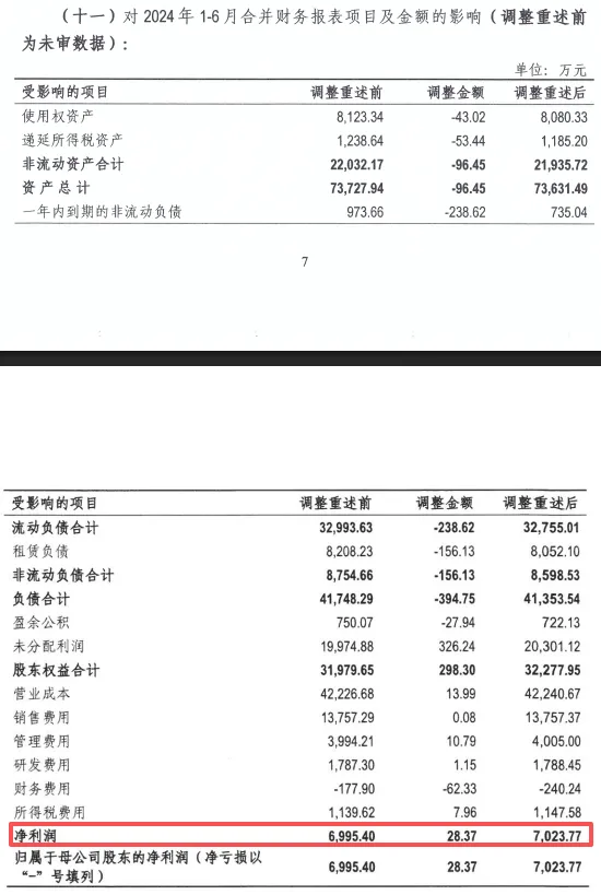 从净利润角度来看,会计调整后,2021年至2024年1-6月合并财务报表净利润分别变动-27.54万元、-250.76万元、-30.48万元、28.37万元,相关情况需要引起重视。