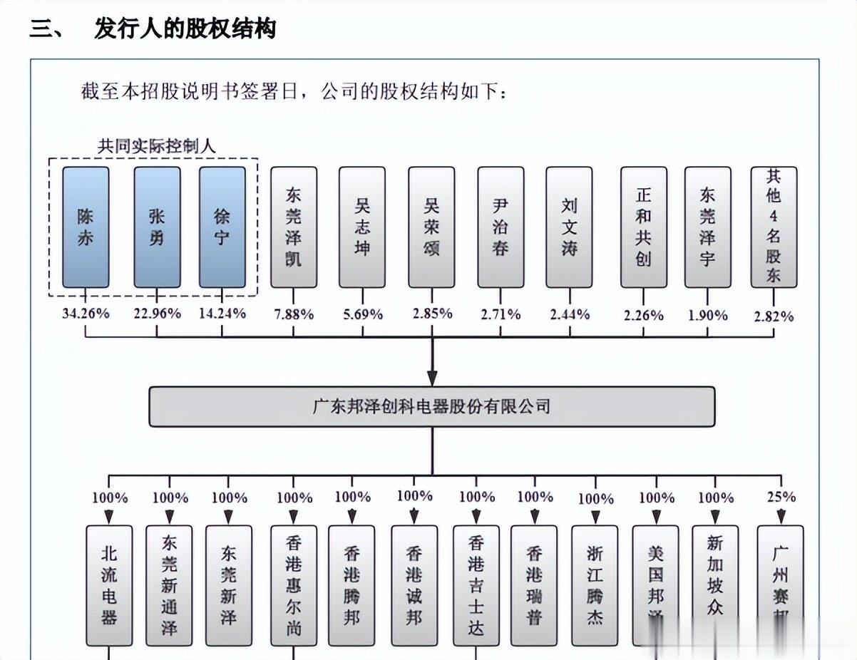 实控人表决权近73%,陈赤辞任董事。邦泽创科控股股东是陈赤,实际控制人是陈赤、张勇、徐宁,三人直接持股比例分别为34.26%、22.96%、14.24%,其中徐宁还通过东莞泽凯、东莞泽宇间接持有1.26%、0.11%的股份,合计持股比例15.61%,三人合计持股比例高达72.83%。