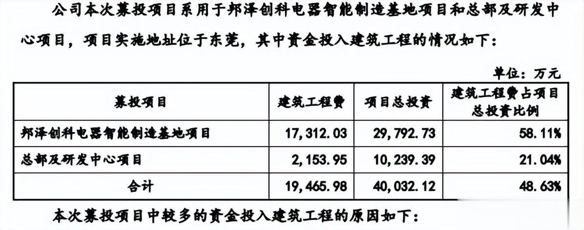扩产步伐较大,基地项目建筑工程费占比超58%。电器智能制造基地项目位于广东省东莞市厚街镇,项目占地面积16,676.64㎡,规划总建筑面积62,793.62㎡,项目建成后将新增555万台的产能。