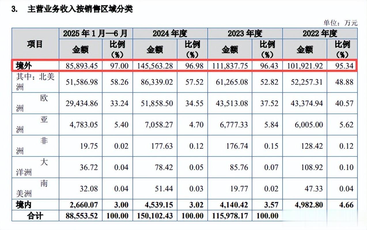 进一步来看,公司主要面向北美洲、欧洲市场,期末销售金额分别为5.16亿元、2.94亿元,占比分别为58.26%、33.24%,而境内收入仅2,660.07万元,占比仅3%。