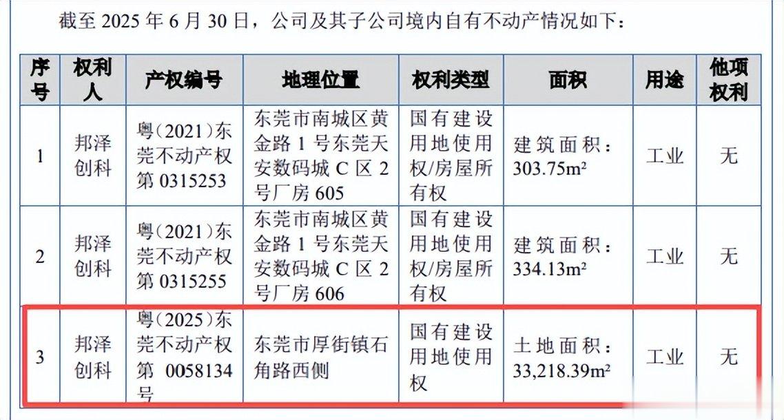 2025年8月,泽创科公告称为保障邦泽创科电器制造总部基地项目建设工程的顺利实施,拟向金融机构额外申请不超过人民币6亿元的项目贷款授信额度,贷款期限不超过十年。该贷款将以位于东莞市厚街镇石角路西侧的不动产(证书编号“粤(2025)东莞不动产权第0058134号”)作为抵押担保。