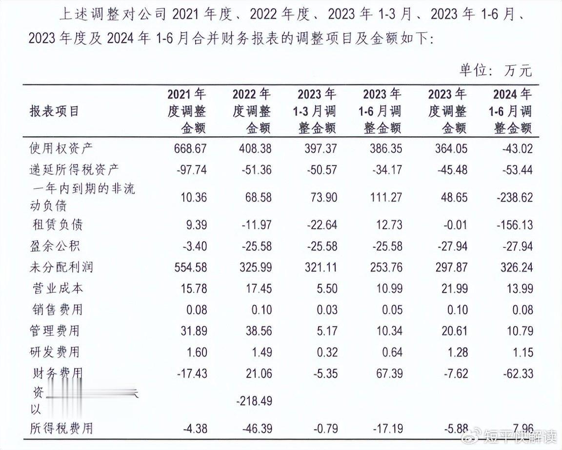 据短平快解读了解,邦泽创科对2021年、2022年、2023年1-3月、2023年1-6月、2023年、2024年1-6月因执行新租赁准则相关的使用权资产、租赁负债等科目核算不准确,导致相关资产、负债、权益以及损益等列报不规范的相关会计差错事项进行了调整,具体参考下图:
