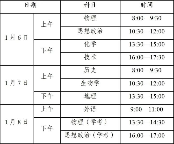 本次考试含高考外语、选考和高中学考。各科目考试时间如下: