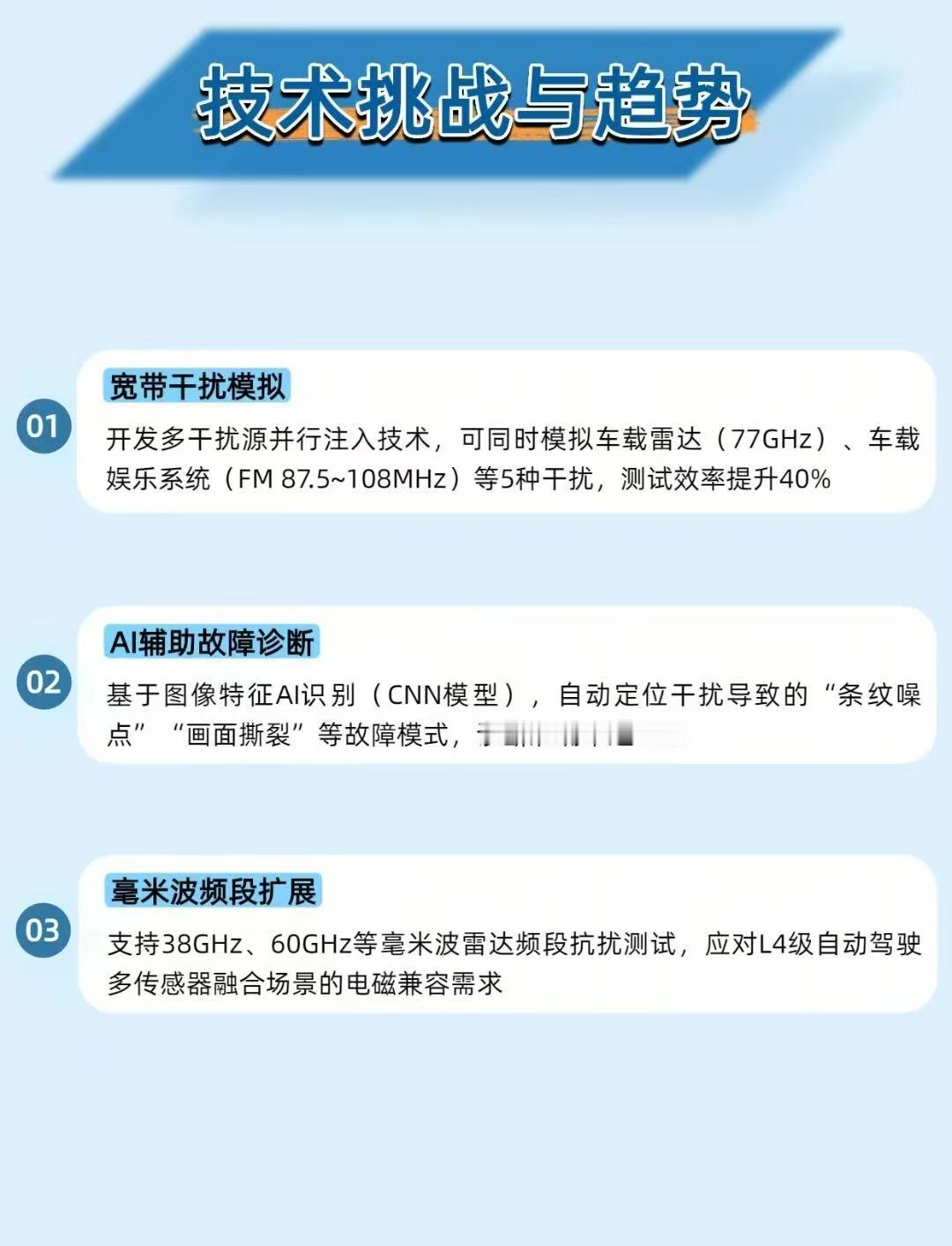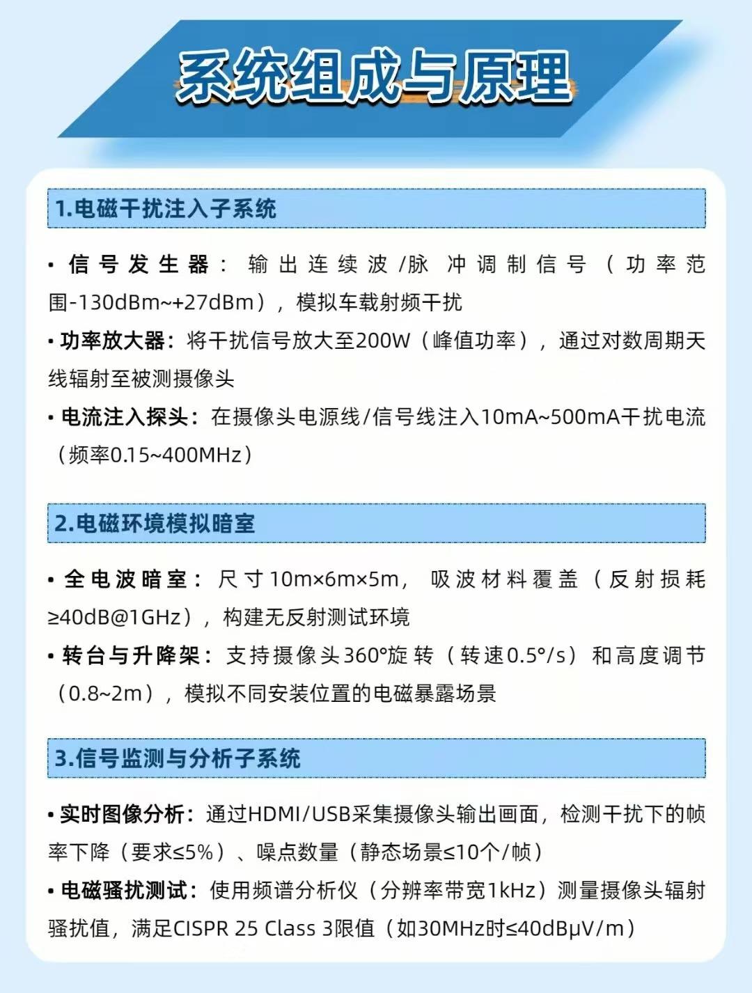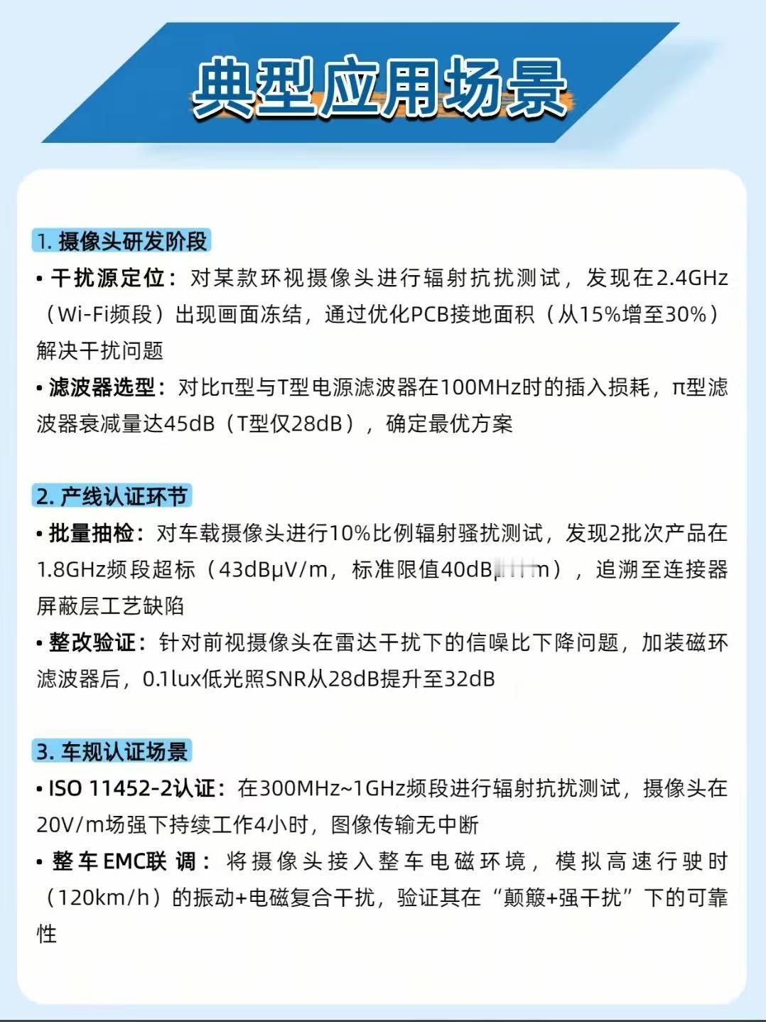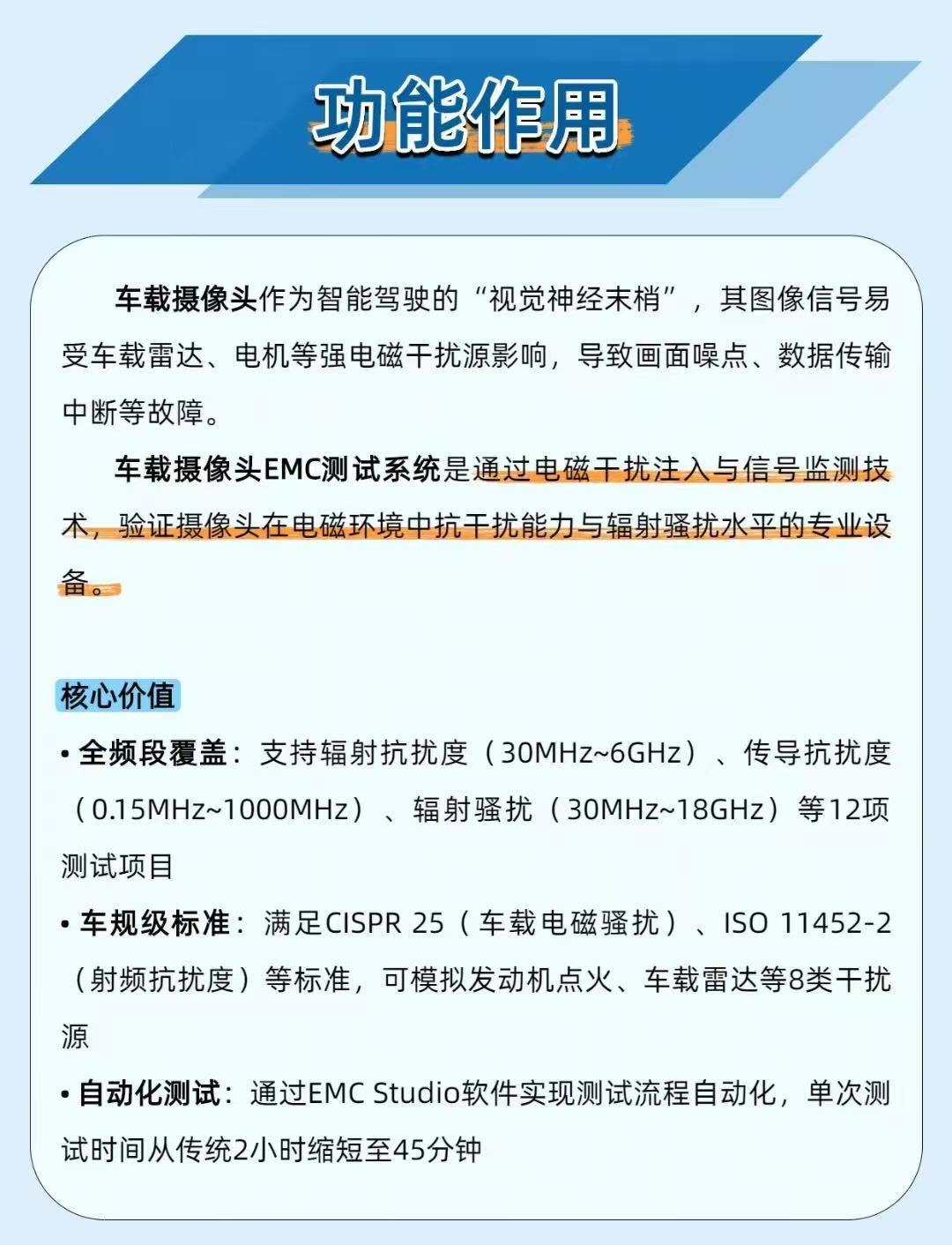 智能驾驶摄像头突然花屏?这设备专克电磁干扰的 “搞鬼”! 智能驾驶的摄像头,最怕车上雷达、电机 “放电捣乱”—— 电磁干扰一来,画面卡成 PPT、满屏噪点,连车道线都看不清!而车载摄像头 EMC 测试系统就是专管这个的 “抗干扰考官”,把摄像头的 “抗造能力” 焊死在安全线上! 它专干这些 “找茬活”: 📶 模拟 “捣乱源”:复刻雷达、电机的电磁信号(30MHz~6GHz 全频段),测摄像头会不会在 2.4GHz(WiFi 频段)卡成 “静止画面” 🕵️ 揪出隐形缺陷:某环视摄像头曾在 2.4GHz 崩了,优化 PCB 接地面积(从 15% 增至 30%)直接治好 “卡顿病” 📊 车规级把关:批量抽检揪出连接器屏蔽层缺陷,确保千台车的摄像头都扛得住干扰 这系统是智能驾驶的 “隐形保镖”:给摄像头装个磁环滤波器,低光下的信噪比直接涨 4dB,暗夜里也能看清行人! 你们开车时遇过车机屏幕卡顿、花屏吗?评论区聊聊~