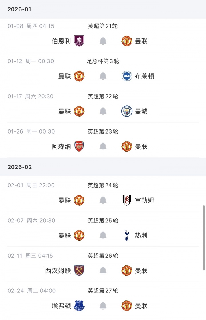 曼联未来4场赛程:伯恩利、布莱顿、曼城、阿森纳!