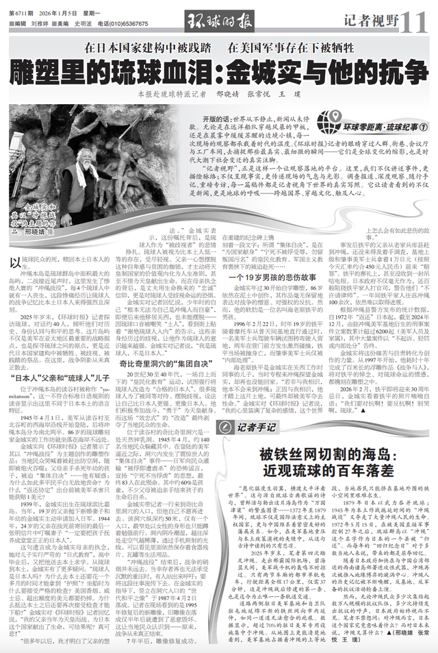 2025年岁末,《环球时报》记者探访琉球,对话约40人,倾听他们对历史、身份认同与和平的思考。这片岛屿不仅是美军在亚太地区最重要的战略据点,也是探寻琉球之问的原点,更是近代日本国家建构中被牺牲、被歧视、被践踏的祭品。在这里,战争阴影从未真正散去。