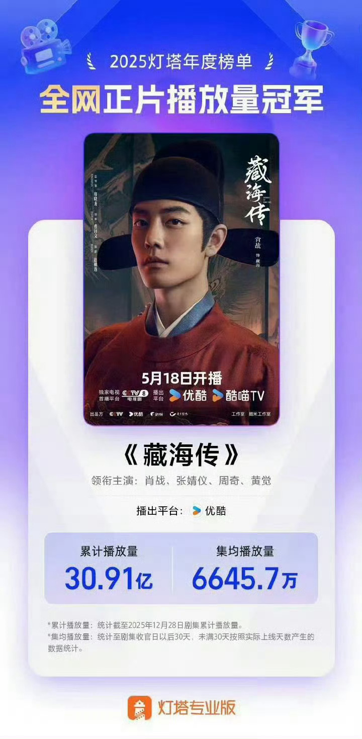 肖战藏海传有多牛?肖战粉丝真的太低调了!肖战的《藏海传》是优酷历史上唯一的一部云合占比40%以上的剧,也是优酷历史上唯一的一部拿下云合,灯塔,猫眼三榜年冠的剧!