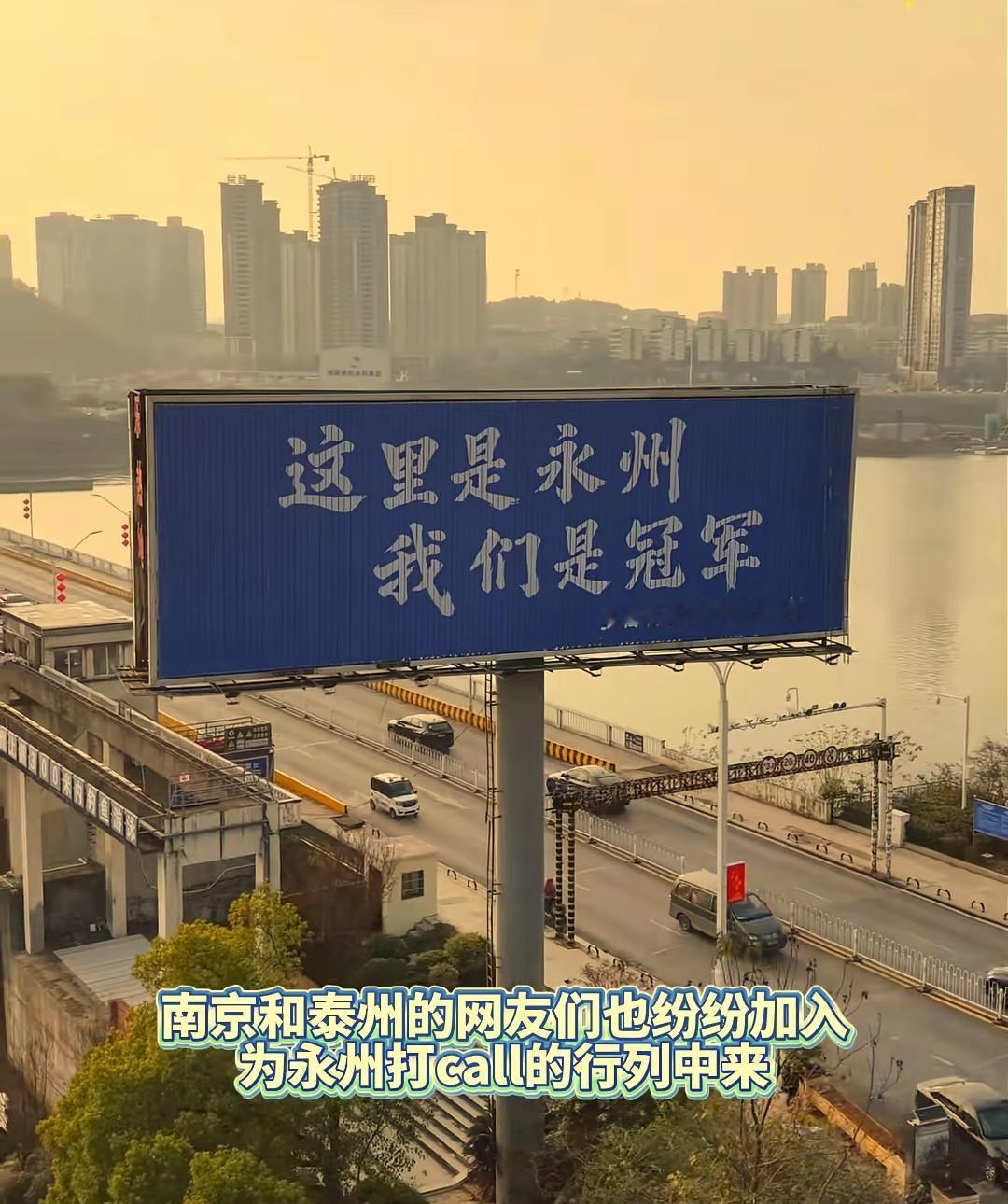 江苏多地市集体为湘超冠军永州打call,这到底玩的是哪出啊? 事情大概是这样的,有苏州网友在“这里是永州、我们是冠军”的广告牌下面署了名——苏州网友 贺。 这下好了,身为江苏老大哥的南京怎肯屈居苏州之下,在隔壁立刻也竖起了一个同样的牌牌,再署名——多省省会南京网友 贺。 新科苏超冠军泰州也不甘落后啊,一模一样来了一个——苏超冠军泰州球迷 贺。 论玩梗,还得是南京网友,一句“多省省会南京”真的是神来之笔啊! 我也是服了这些人了,玩梗在自己省内玩玩也就算了,现在隔了几个省玩到湖南去了!