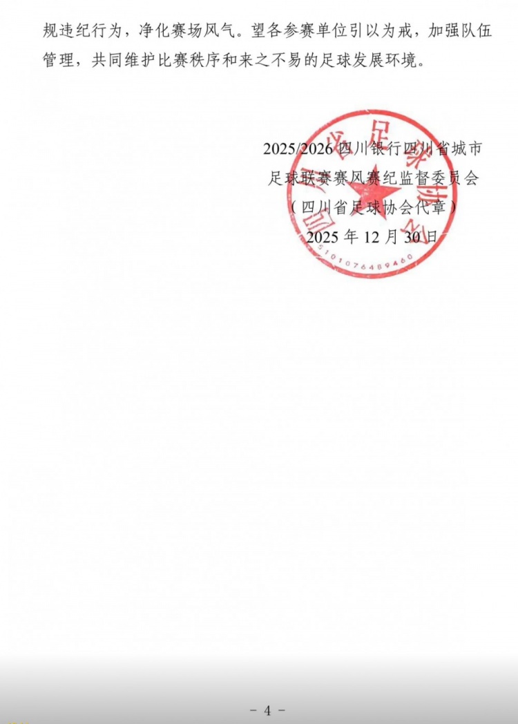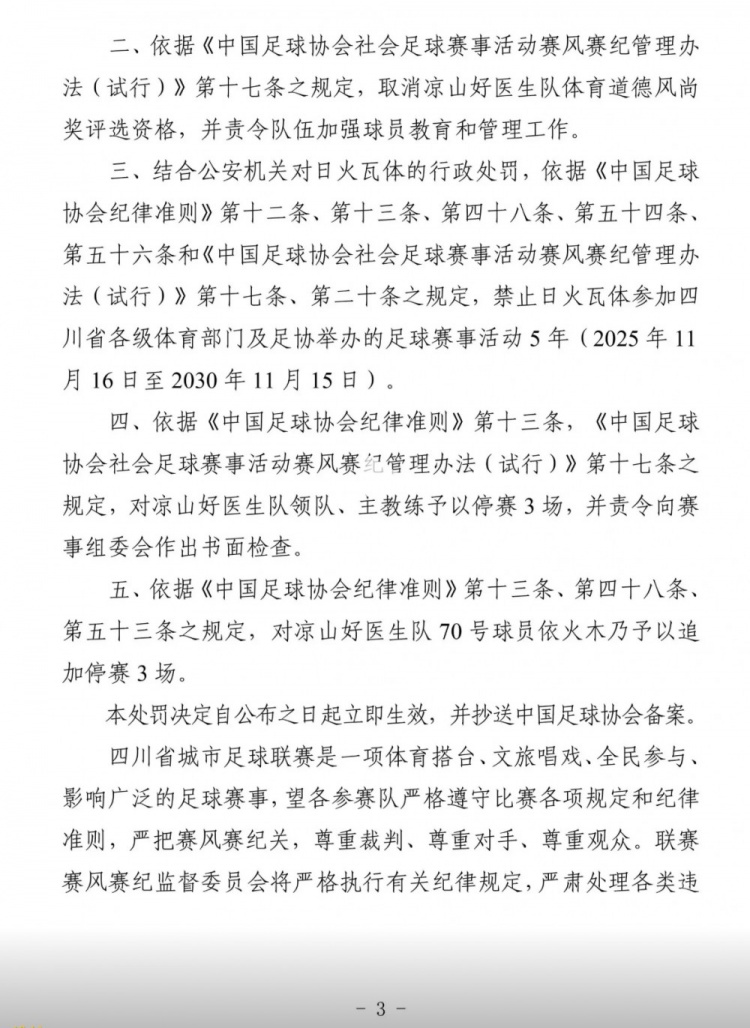 最终,四川省足协依据相关规定,对日火瓦体做出了禁止参加四川省各级体育部门及足协举办的足球赛事活动5年的处罚。