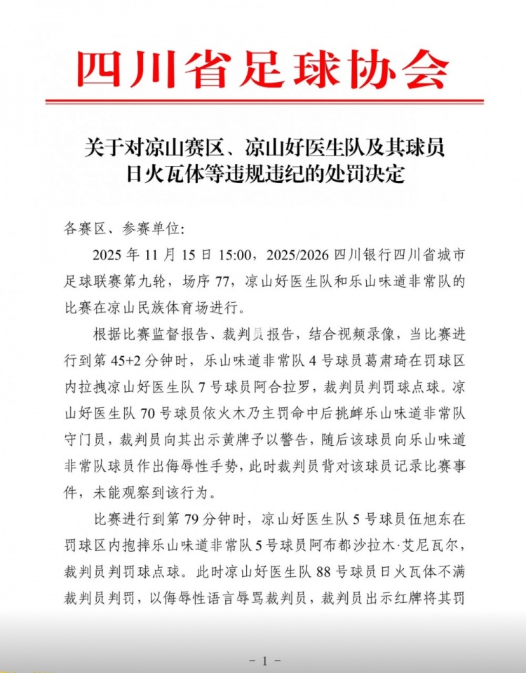 直播吧1月5日讯对于川超比赛中出现严重暴力行为的日火瓦体,四川省足协对其做出了省内比赛禁赛5年的处罚。
