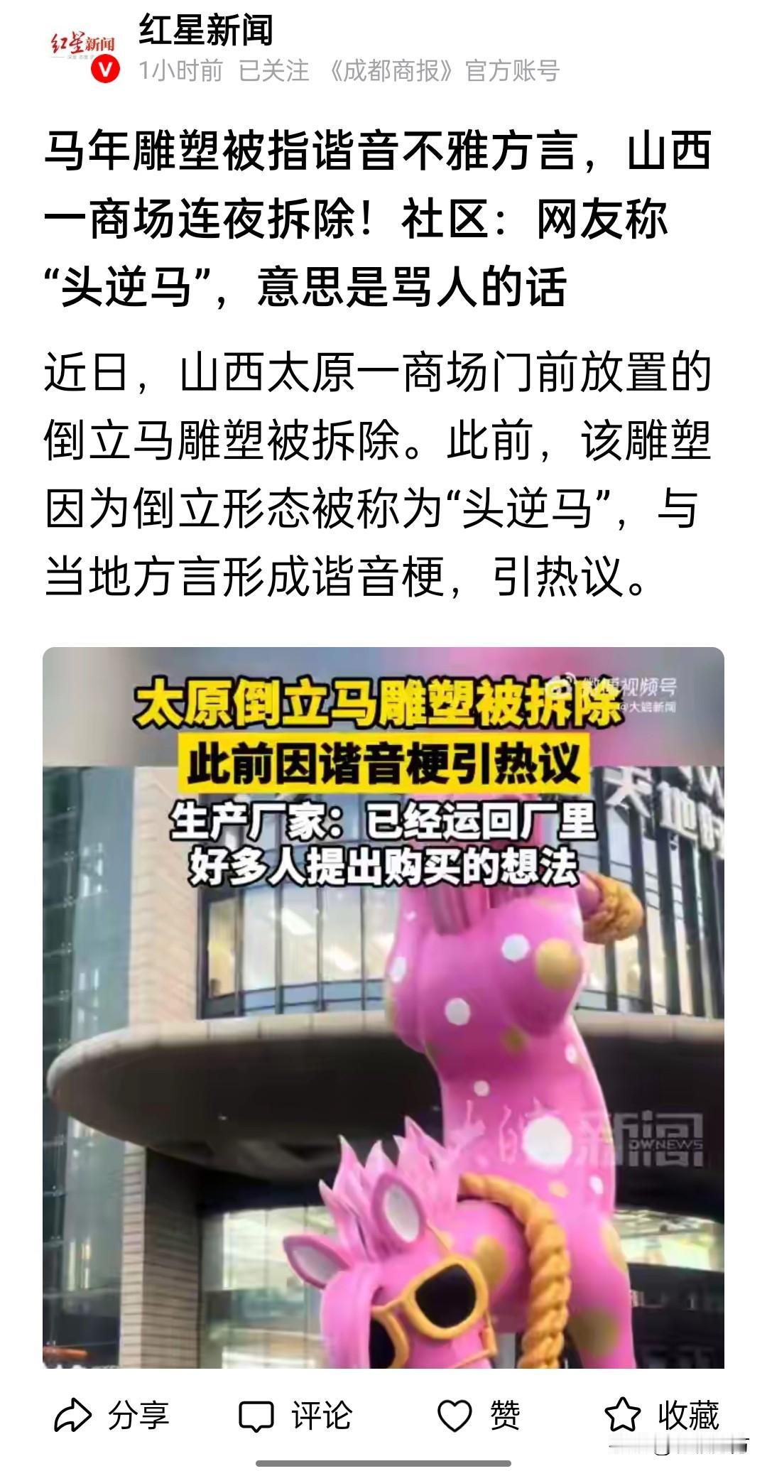 一则喜感新闻,太原一商场的倒立卡通马雕塑被紧急拆除,本来厂家想寓意“马到成功”,