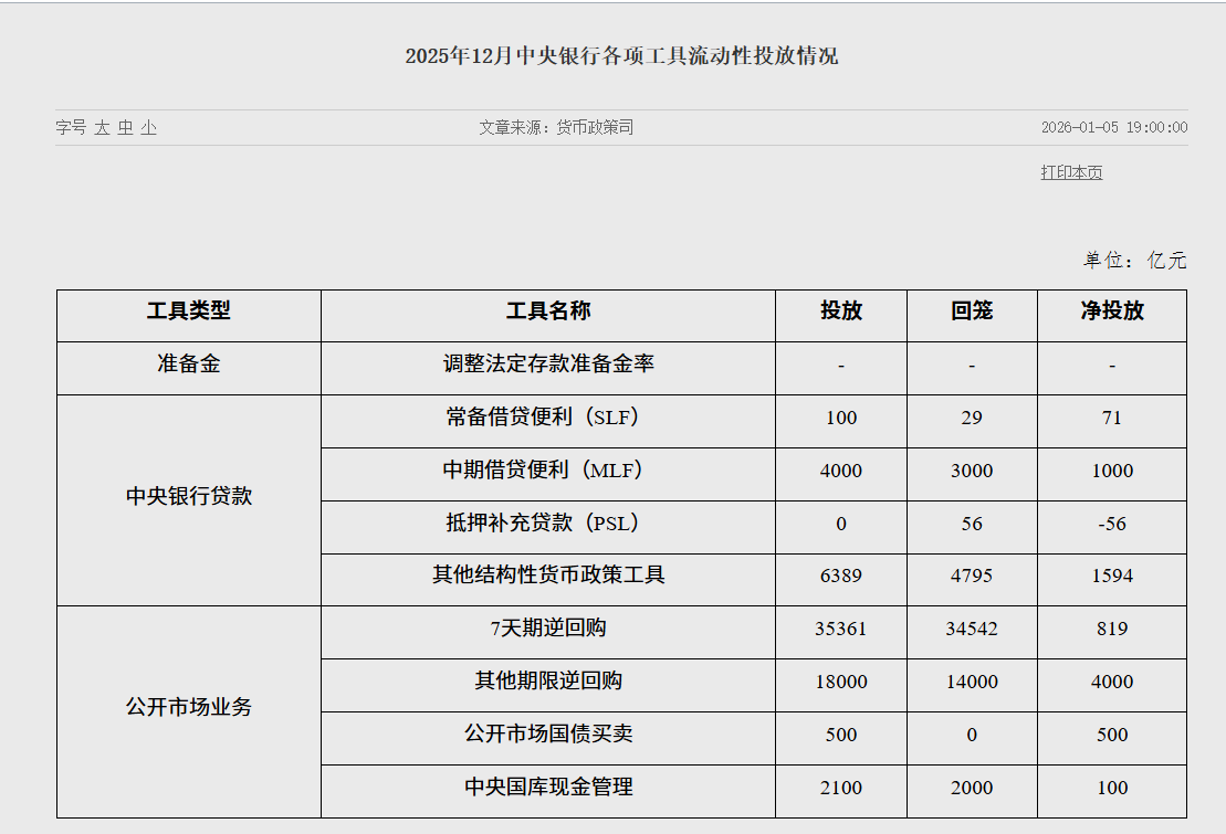 上证报中国证券网讯1月5日消息,中国人民银行今日公布2025年12月中央银行各项工具流动性投放情况。