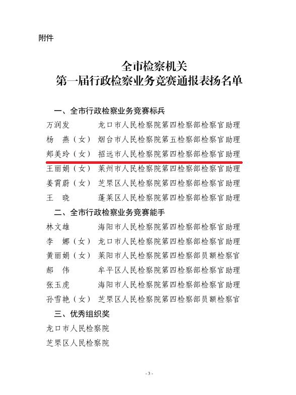 近日,烟台市检察机关第一届行政检察业务竞赛圆满落幕。招远市人民检察院第四检察部干警郏美玲荣获“全市行政检察业务竞赛标兵”称号。