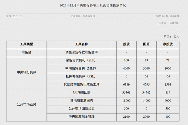 1月5日,央行公布2025年12月各项工具流动性投放情况: