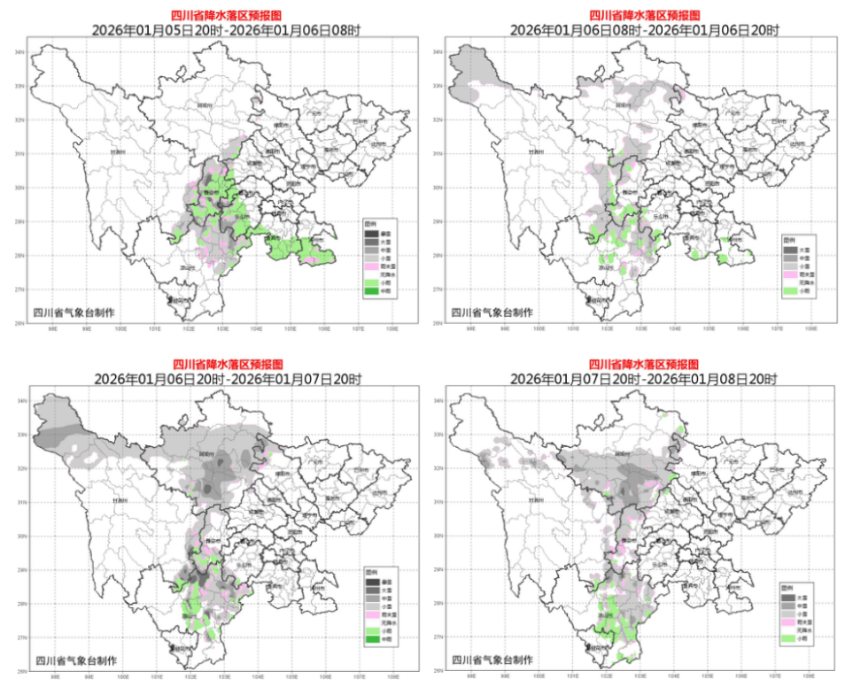 根据四川省气象台今天下午最新预报,5日晚上至8日白天,盆地西部南部沿山阴天间多云有零星小雨,高海拔山区有雨夹雪或雪,其余地方以多云天气为主;川西高原东部北部和凉山州东部北部多阵雪(雨),局地有中到大雪,需防范雨雪冰冻天气对交通、重大工程施工等带来的不利影响,川西高原和攀西地区其余地方以多云间晴天气为主,午后风力较大,森林草原火险气象等级较高,需加强火源管理和森林防火工作。