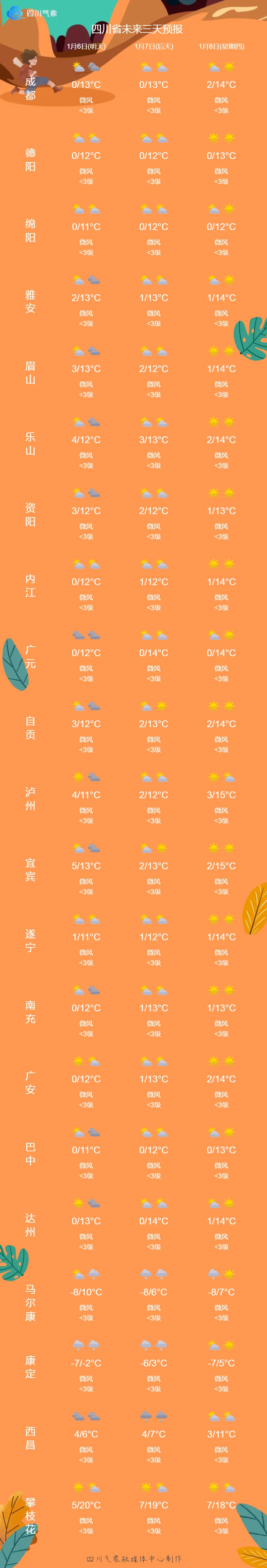 预计今天晚上,成都、德阳、绵阳、内江、广元、南充、广安、巴中、达州等盆地城市最低气温将降至0℃。今天晚上到明天白天,四川东北部局地有雾。