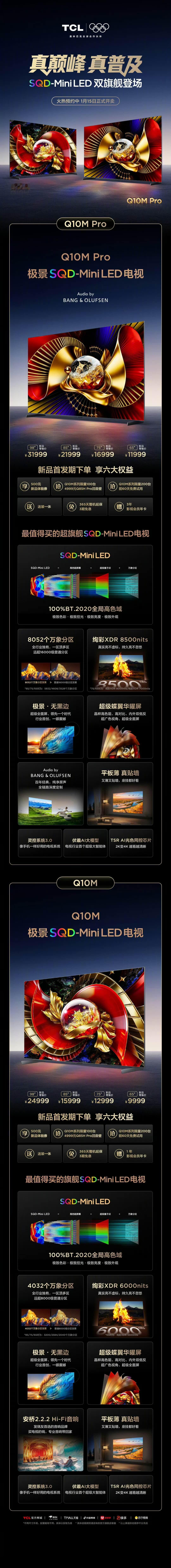 TCL今天发布了双旗舰新品Q10M和Q10M Pro,将专属于机皇X11L的SQD-Mini LED全面下放,带来了全局高色域、更高的绝对峰值亮度还有 Mini LED 更多物理控光分区带来的高对比度优势。Q10M Pro不仅拥有100% BT.2020全局高色域,还有最高8052个万象分区和绚彩XDR 8500峰值亮度,Q10M Pro售价 11999元起,Q10M售价 9999元起[灵光一闪]