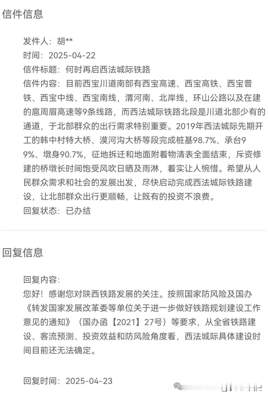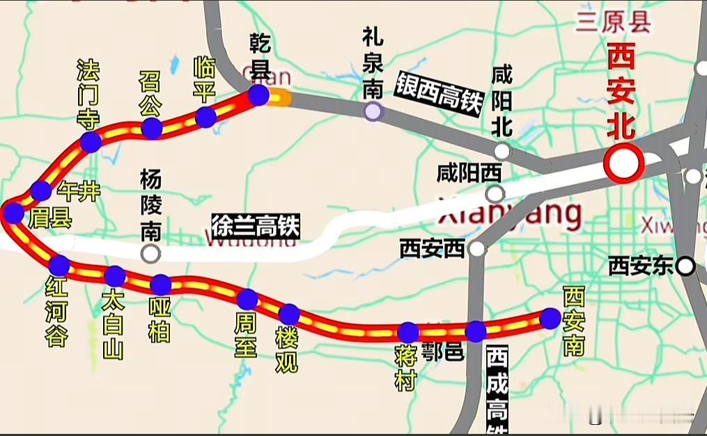 西法城际铁路🛤️规划 西法城际铁路🛤️规划 分为两部分组成 北线和南线 北线从西安北站🚉引出 利用西银高铁从乾县站向西引出 规划设临平站🚉,扶风召公站, 扶风法门寺站,扶风午井站,眉县站 南线从规划西安南站引出,经鄠邑, 周至,哑柏,太白山,红河谷, 在眉县与北线汇合, 形成环线铁路🛤️网络。 目前,西法城际铁路🛤️项目已 暂停多年,具体建设项目 重启计划目前仍未知。