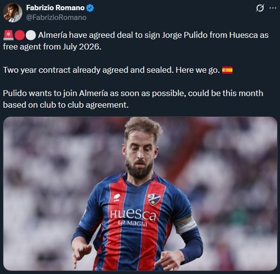 罗马诺写道:“阿尔梅里亚已达成协议,将于2026年7月以免签形式从韦斯卡签下豪尔赫·普利多。双方已敲定并签署了一份为期两年的合同。交易确认达成。”