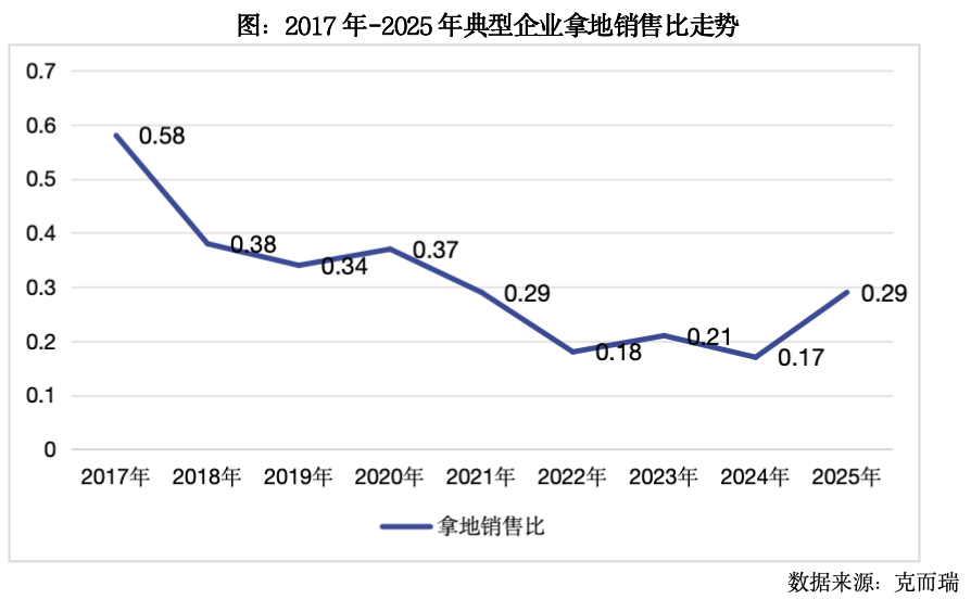 第二,整体拿地销售比从底部企稳回升。2025年销售全口径前100企业拿地销售比平均为0.29,较2024年上升0.12,回归到2021年投资力度水平。当然这主要是规模房企积极投资所带动。同时我们也监测到百强中仍有近五成企业2025年未有土地入账。