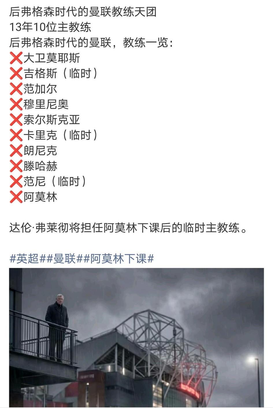 英超十月最佳教练阿莫林下课了;英超十一月最佳教练马雷斯卡也下课了。 阿莫林由于赛后硬杠管理层,被曼联业余管理层无预警下课。其实曼联的战绩并不差,至少没掉队,还有很大希望进前四。 有时候确实搞不懂,之前排名十几名的时候不下课,现在带到第6居然下课了。 两个告别红色主色的人一喜一悲:周冠宇告别法拉利去了凯迪拉克;阿莫林告别曼联就此失业。