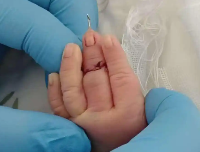 据盛先生介绍,2025年12月25日9时30分许,妻子在盱眙县人民医院接受剖宫产手术,10时30分孩子顺利出生。当日12时左右,医生告知他:手术过程中出现意外,孩子左手中指断了。对此,盛先生无法接受:“这么大的医院,怎么会犯这么低级的错误?”事发当天,孩子便两次转院,紧急送往无锡市第九人民医院接受断指再植术。之后,孩子又在无锡儿童医院观察了一段时间,目前回到盱眙县人民医院继续治疗观察。由于断指处有钢针做固定,这也导致孩子无法接受异物在体内,便时时常哭闹不止,让人揪心不已。