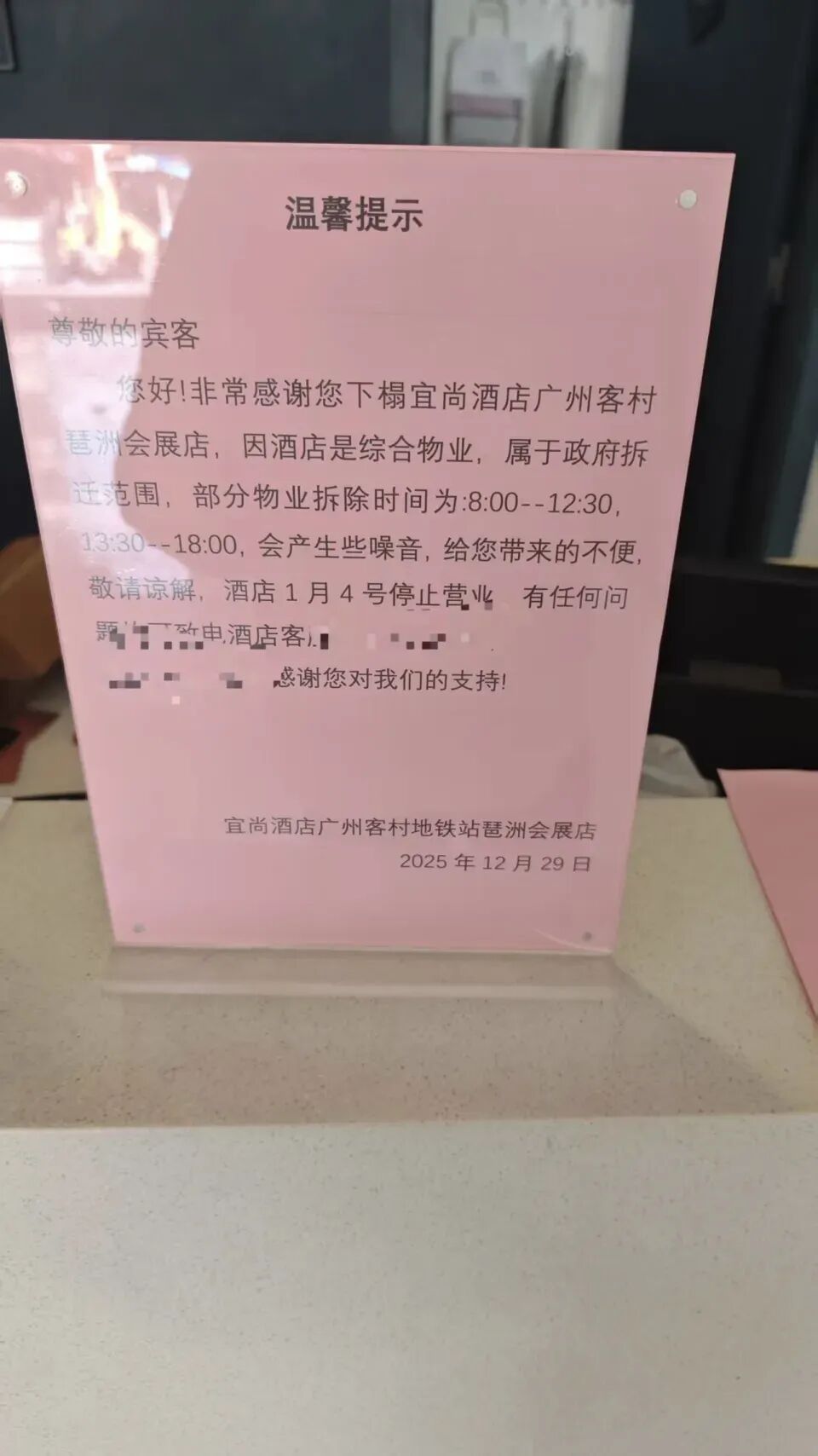 记者了解到,该网民所入住的酒店为宜尚酒店广州客村地铁站琶洲会展店。随后,记者联系到宜尚酒店工作人员俞女士。俞女士告诉记者,涉事酒店所在片区属于政府统一拆迁范围,酒店在2025年12月29日就已在前台、电梯口、大门口三个显眼位置张贴了温馨提示函,明确标注了拆迁时间和停业安排,同时在客人入住时也会进行口头提醒。“可能个别客人没有太留意这些提示。”