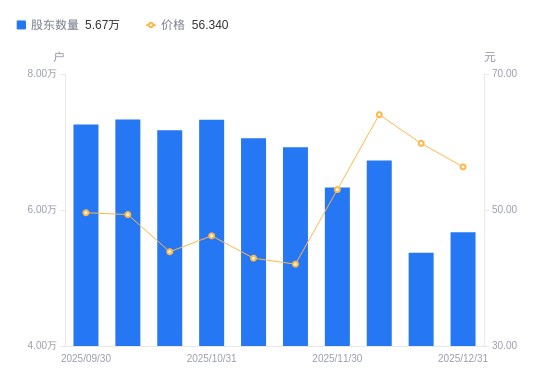 日期A股户数(户)流通A股户均持股数(股)户均持股市值(万元)2025-12-31567398250.9746.492025-12-19537208714.6652.112025-12-10672886957.4344.542025-11-30633267392.7339.182025-11-20692466760.7028.422025-11-10705346637.2528.482025-10-31732746389.0629.522025-10-20717386525.8528.622025-10-10733236384.7931.502025-09-30725666451.3932.00