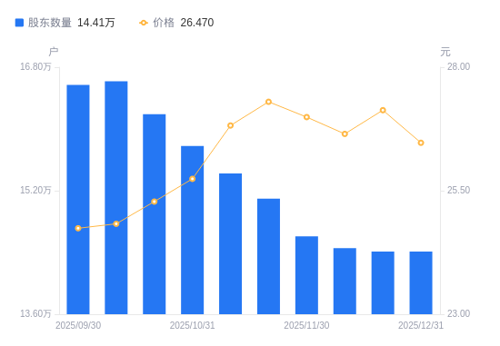 日期A股户数(户)流通A股户均持股数(股)户均持股市值(万元)2025-12-3114412724035.8363.622025-12-1914412224036.6665.212025-12-1014455223965.1663.872025-11-3014610223710.9264.002025-11-2015095722948.3462.652025-11-1015424222459.5960.242025-10-3115780421952.6356.512025-10-2016190921396.0454.092025-10-1016619020844.8951.762025-09-3016571320904.8951.72