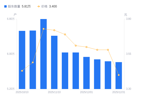 日期A股户数(户)流通A股户均持股数(股)户均持股市值(万元)2025-12-315814266840.8622.732025-12-205833966615.1523.852025-12-105878066115.3623.672025-12-015933965492.5323.582025-11-216034864397.5123.252025-11-206034864397.5123.762025-11-106417260560.0722.532025-10-316799557155.1021.322025-10-206537559445.6820.752025-10-106529559518.5120.41