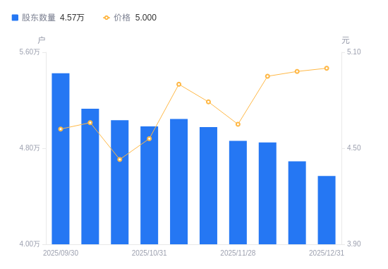 日期A股户数(户)流通A股户均持股数(股)户均持股市值(万元)2025-12-314569120517.9110.262025-12-194691019984.739.952025-12-104849019333.559.572025-11-284862019281.858.972025-11-204976618837.839.022025-11-105044718583.549.112025-10-314982318816.288.582025-10-205033218626.008.252025-10-105129318277.038.522025-09-305425017280.817.98