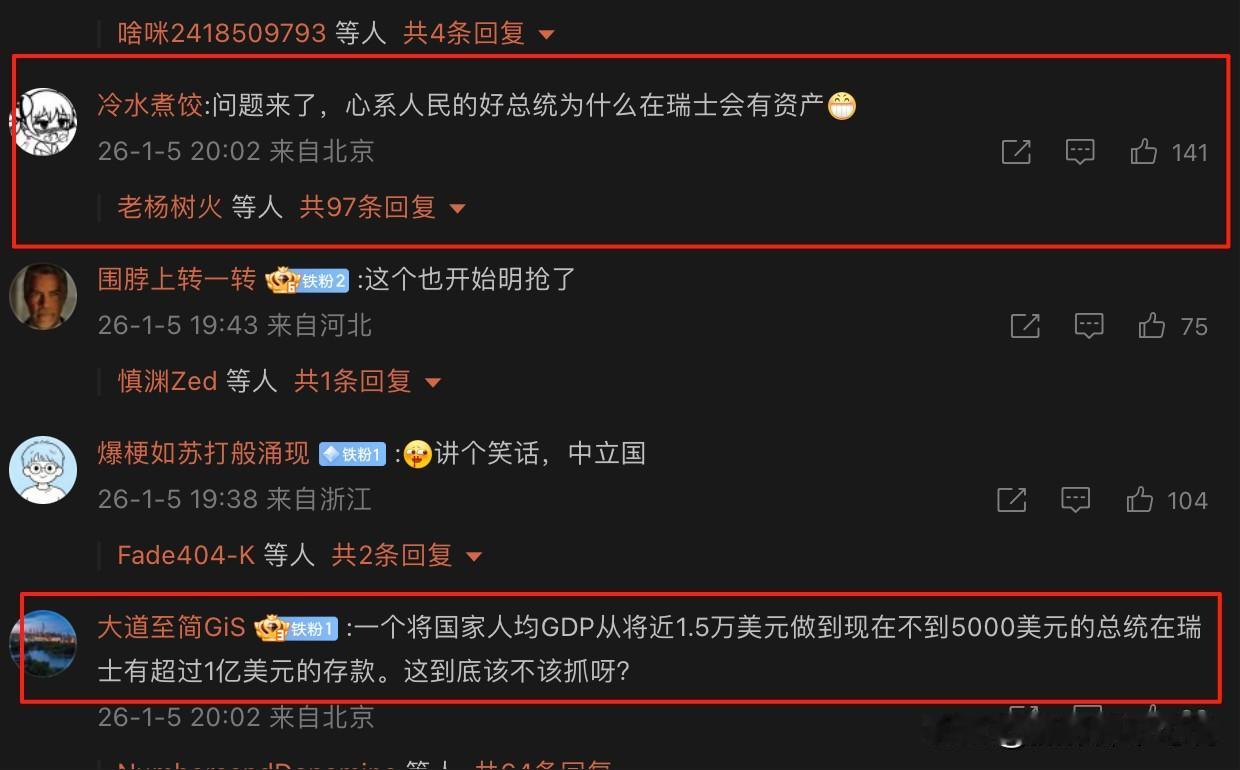 马杜罗在瑞士有1亿美元存款?刚刚看到新闻说瑞士宣布冻结马杜罗在瑞士资产,一会儿评论区就有人说马杜罗在瑞士有1亿存款,所以该抓。还有人说“问题来了,心系人民的好总统为什么在瑞士会有资产”。我看了这些流言觉得很好笑,这个超过1亿美元的存款有正规媒体报道确认吗?反正我是没有查到相关的报道和可靠信源。此外,也不排除这是美国操控的舆论战的可能性,毕竟都把人家总统给绑架了,还有啥事儿干不出。再者,瑞士说要冻结马杜罗的资产,多少资产都没说,1万美元、10亿美元都有可能。如果只有1万美元那就不是事儿,但网民们肯定会往上亿以上猜测吧!