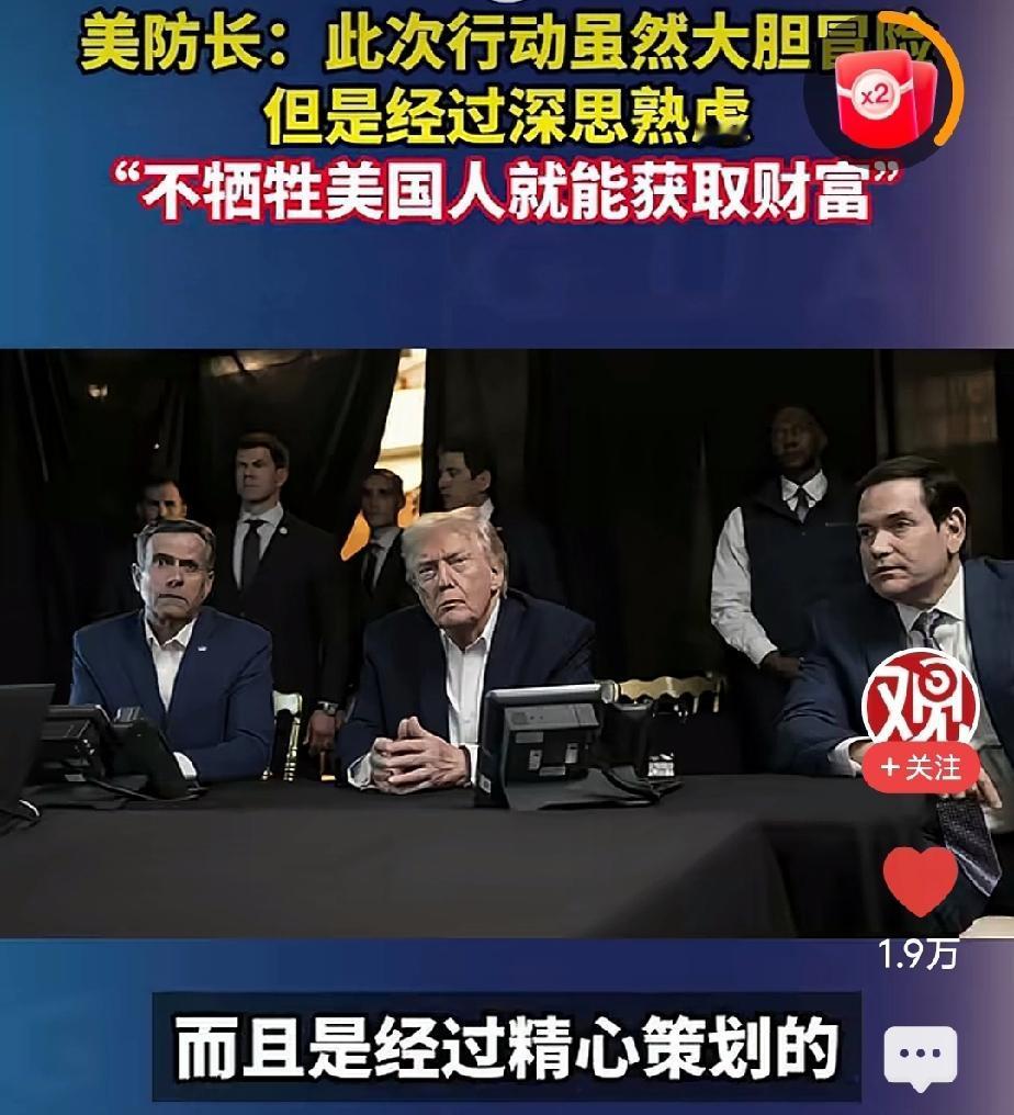 美国人不要脸的竟然如此理直气壮。 在别的国家没有做任何违法的行为的情况下,偷偷把人家总统从被窝里给抓走。 美国防长大言不惭地说,美国人经过足够长时间深思熟虑的筹划,精心设计的,没有让美国人流血,就让别的国家把财富吐出来,那意思,美国这次赚大发了。 好像这种用霸道手段抢来的财富是多么的自豪!他们这么做好威武!根本不考虑受害国的死活,简直没天理了。 图片来自网络侵删致歉