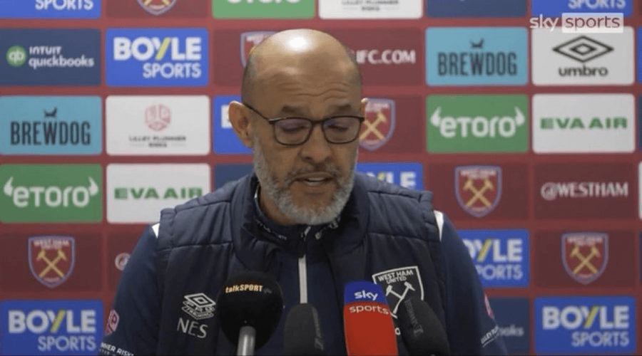 而对于这一情况,西汉姆联主帅努诺-桑托在出席新闻发布会时也谈到了自己看法。他表示:”和大家一样,我感到惊讶和难过。他是葡萄牙人,年轻的主帅,但事实就是如此。我们知道这就是行业的运作方式。“