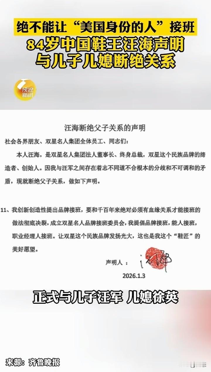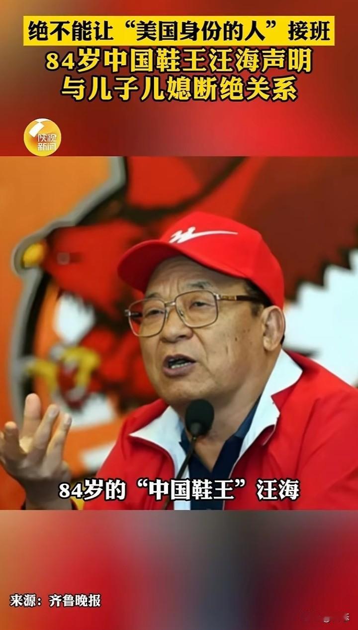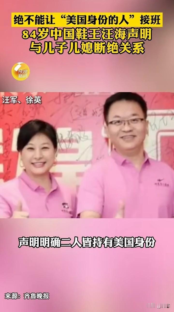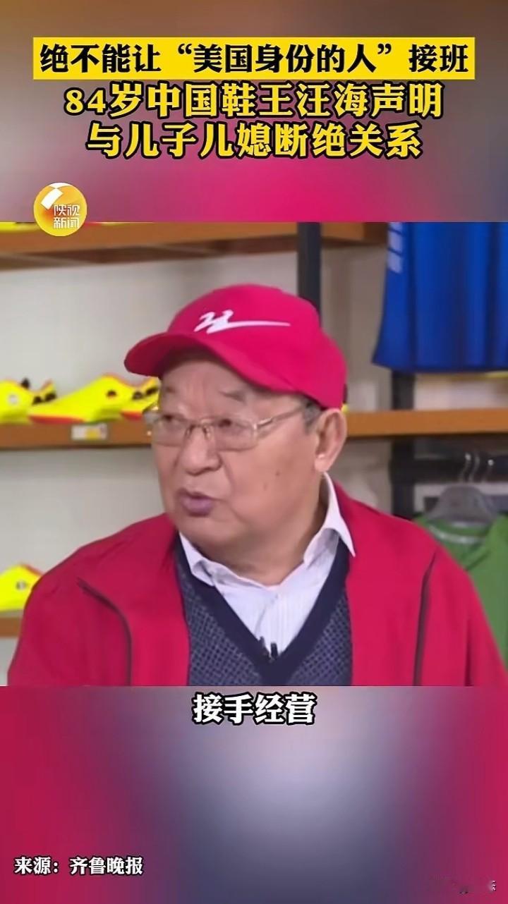 绝不能让有美国身份的人接班,号称中国84岁鞋王的王海明称与儿子和儿媳断绝关系。我相信如果儿子和儿媳没做对不起老人家的事,说会和自己的孩子断绝关系呢? 双星总裁的身份,因为和儿子有着不可调节的矛盾,双星是民族品牌,儿子和儿媳是美国身份,老人家不允许出现这样的身份。 说实话在民族大义面前,他选择了前者,值得我们点赞。创立一个民族品牌是非常不容易的。要人爱国的人接班才是老人家需要的。 为他点赞!