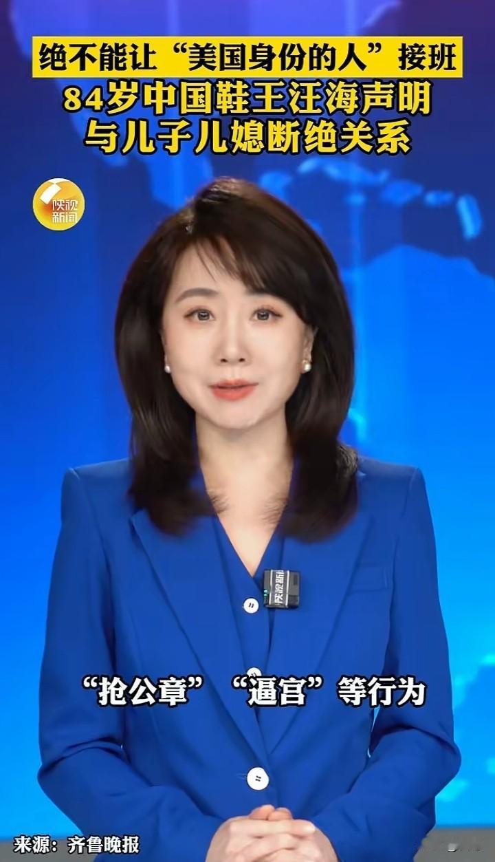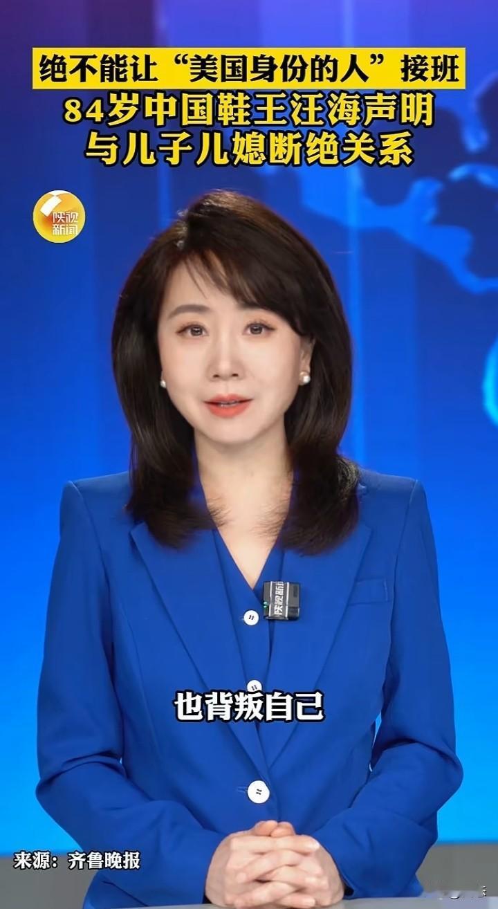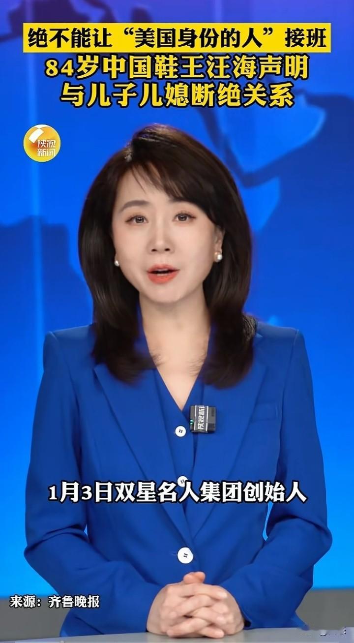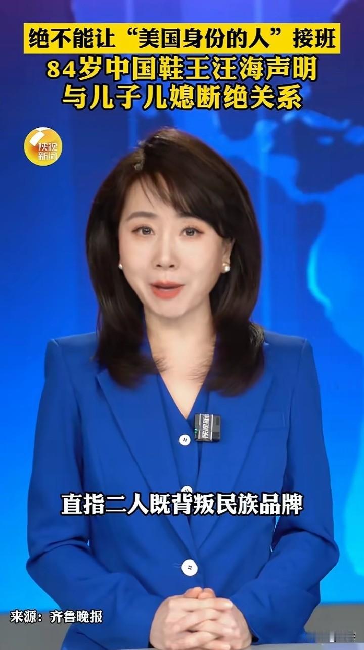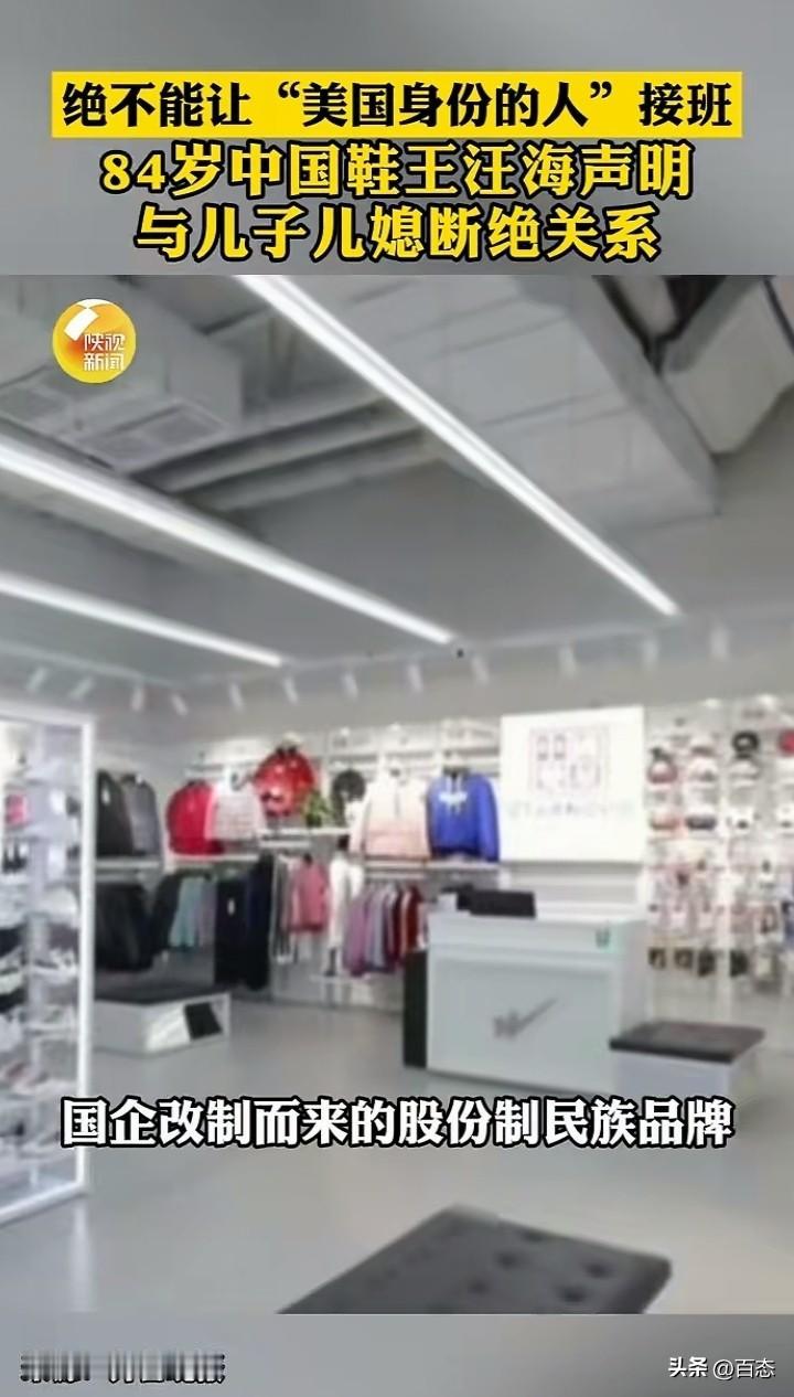 绝不能让有美国身份的人接班,号称中国84岁鞋王的王海明称与儿子和儿媳断绝关系。我相信如果儿子和儿媳没做对不起老人家的事,说会和自己的孩子断绝关系呢? 双星总裁的身份,因为和儿子有着不可调节的矛盾,双星是民族品牌,儿子和儿媳是美国身份,老人家不允许出现这样的身份。 说实话在民族大义面前,他选择了前者,值得我们点赞。创立一个民族品牌是非常不容易的。要人爱国的人接班才是老人家需要的。 为他点赞!