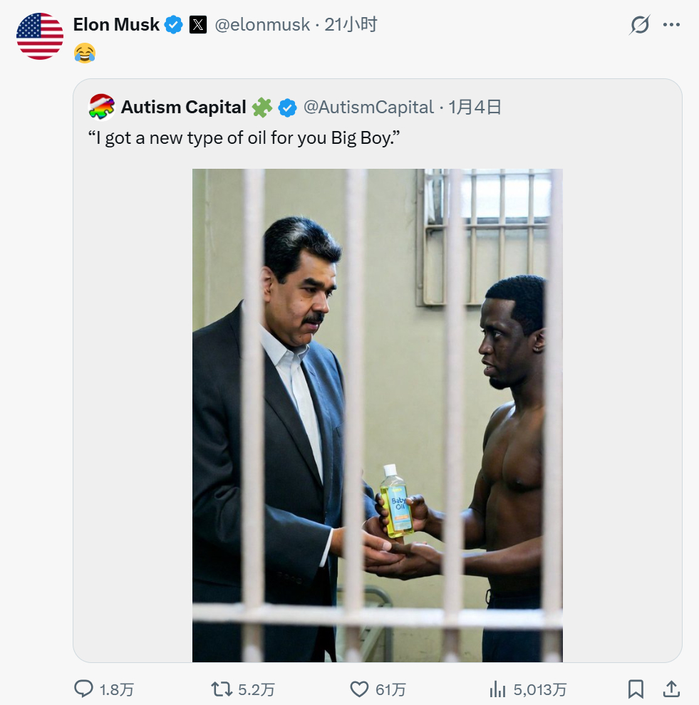 马斯克在这次特朗普政府绑架马杜罗的行动中充当的角色实在令人怀疑:其一,马斯克绝对没有完全置身于事外。其二,特朗普和赫格塞斯等人实时收看绑架马杜罗行动时,大屏幕上滚动的正是X页面。其三,在绑架完成之后,很多所谓委内瑞拉民众欢呼马杜罗下台的视频都首发自X平台。其四,马斯克最早为特朗普的“胜利”欢呼。其五,美国情报机构和美国军队半年以来都在使用人工智能侦察马杜罗的动向,而特朗普上台之后,美国政府人工智能平台承包商正是马斯克利益体。其六,马斯克对马杜罗的态度并不是一般的对立,而是嘲笑和侮辱。其七,特朗普通过此次行动,还并没有征服马杜罗,却再次征服了马斯克。其八,马斯克穿着一件科技之神外衣,现已透出里面还有一件美国至上卫衣。还有,“星链”卫星在太空已经对中国空间站的安全形成直接威胁,且似乎仍没有解决方案。马斯克在十多年前曾经公开嘲笑比亚迪汽车,但现在特斯拉已经完全被比亚迪碾压,接下来,随着中国新能源汽车的群体崛起,特斯拉的全球市场只会更加萎缩,特斯拉是马斯克事业的资金池,现在中国人给这个池子开了一个大口子。马斯克是一个有着鲜明政治理想的人,无论是对美国,还是对委内瑞拉,还是对中国。特朗普绑架马杜罗,这在美国都极具争议,但马斯克作为企业家头一个站出来支持,在他的眼里,成败就是是非,美国与非美国就是是非,他才是真正的美国至上主义者——所以对其他国家来说,他可能比特朗普还要危险。