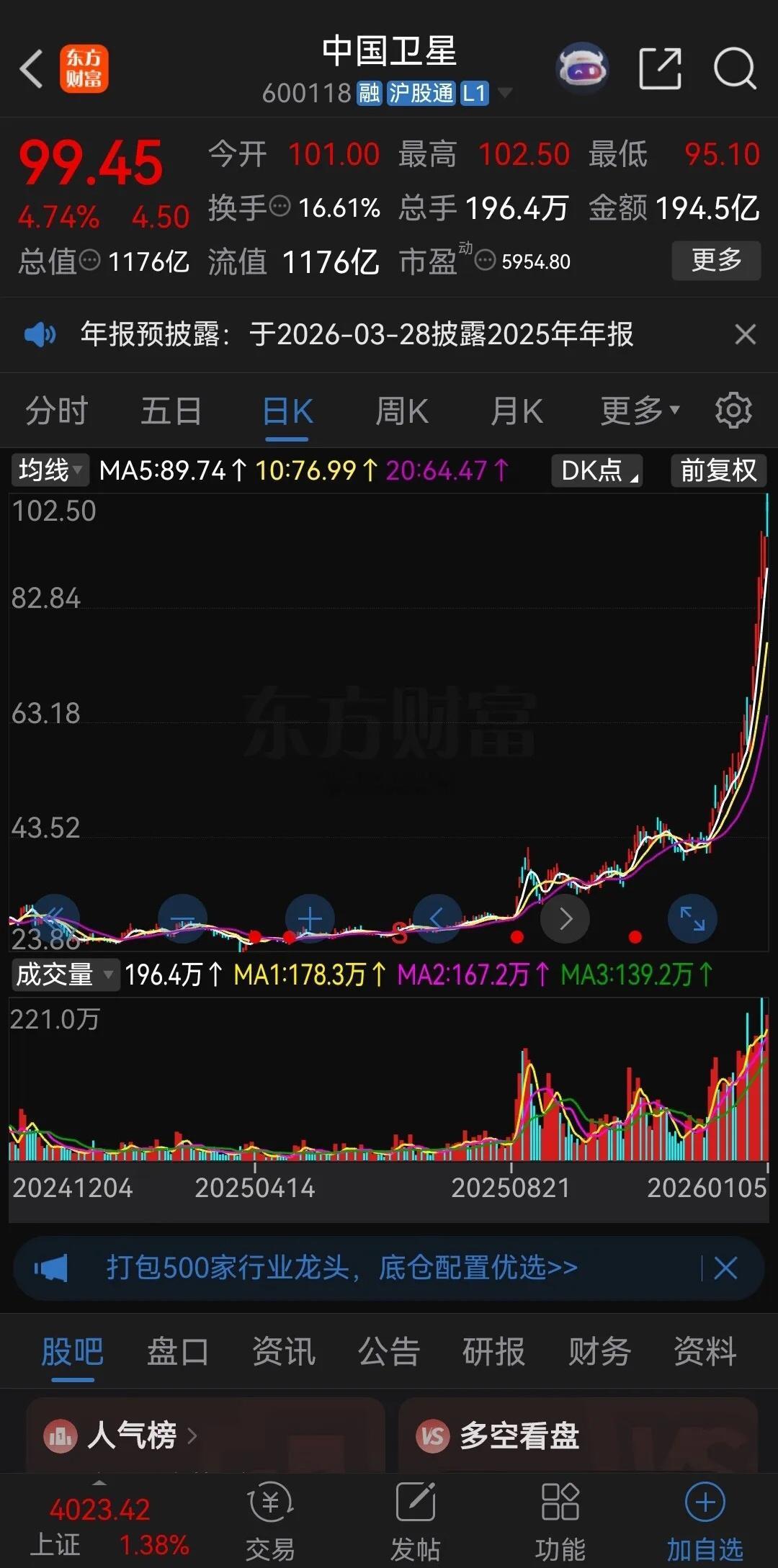 不鸣则已,一鸣惊人!中国卫星这波涨幅太猛了,2025年四月份最低还在23块多钱,今天最高涨到了102.5元,8个月涨了近5倍,并创出了上市28年以来的新高,交投非常活跃,每天一二百亿的成交额,一千多亿的盘子,都能涨得那么轻松自如,可见这波行情蓄谋已久了!在这波行情没启动之前,中国卫星从2016秒就开始横盘震荡,算下来已经横盘了9年,来回洗盘,特别是这次启动前,股价波动很小,K线都快走成了一条直线,散户早已被洗的秃噜皮了,没有几个散户能忍受的了的,所以也享受不到后面的大涨!看来,想在股市里挣大钱,必须有耐心才行!