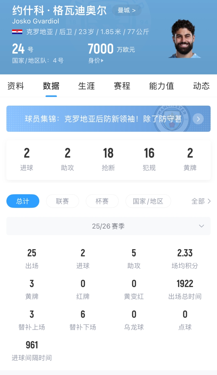 格瓦迪奥尔新赛季至今为曼城各赛事出战23场,累计接近1800分钟,是球队后防主力。目前曼城正处在多线争冠当中,缺少格瓦迪奥尔,曼城在急需引援的同时也需要调整阵容。