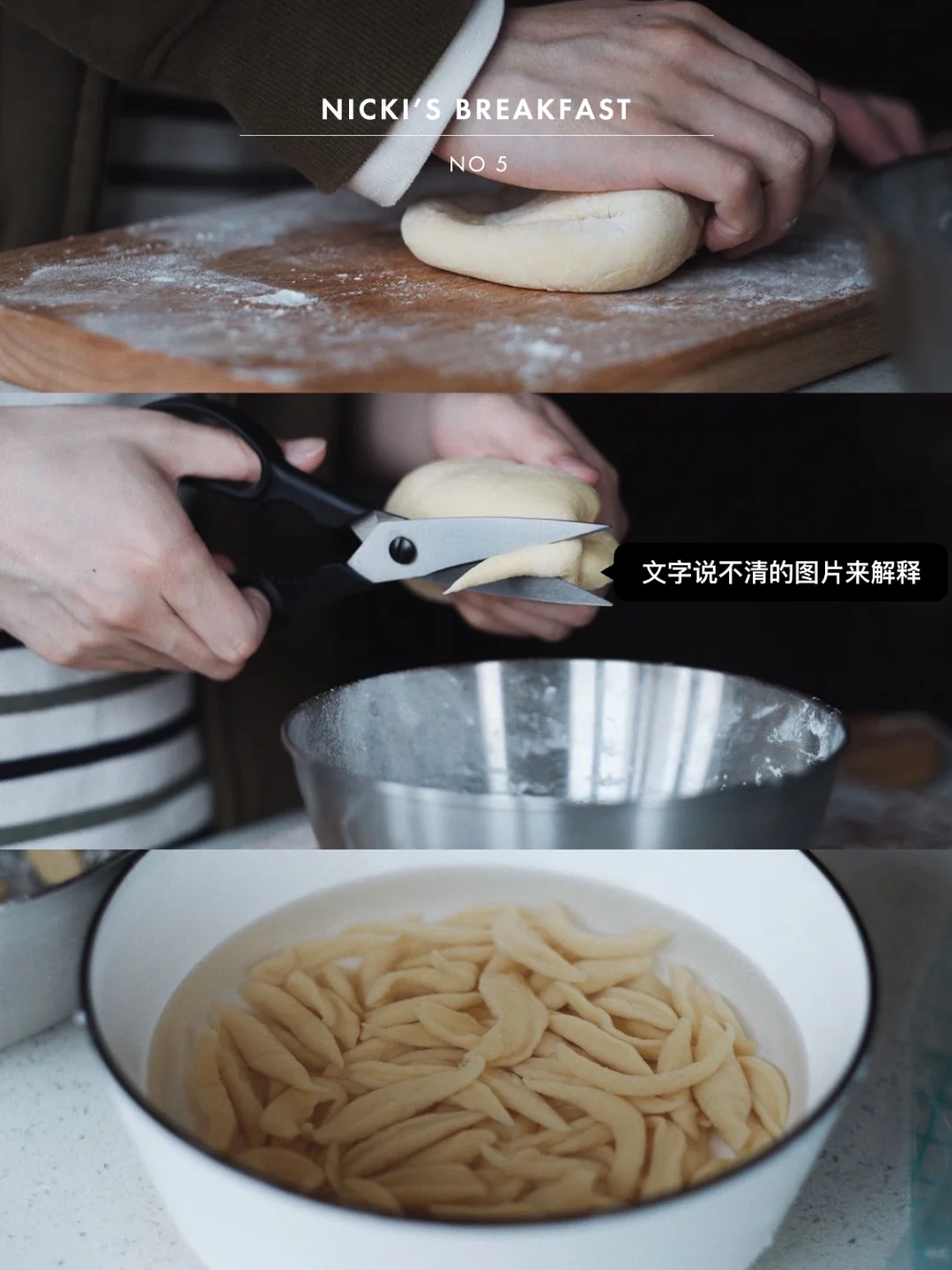 •中筋面粉里加一个鸡蛋、一勺盐、水慢慢加,用筷子搅拌成絮状,将面粉揉成团,醒20分钟左右。