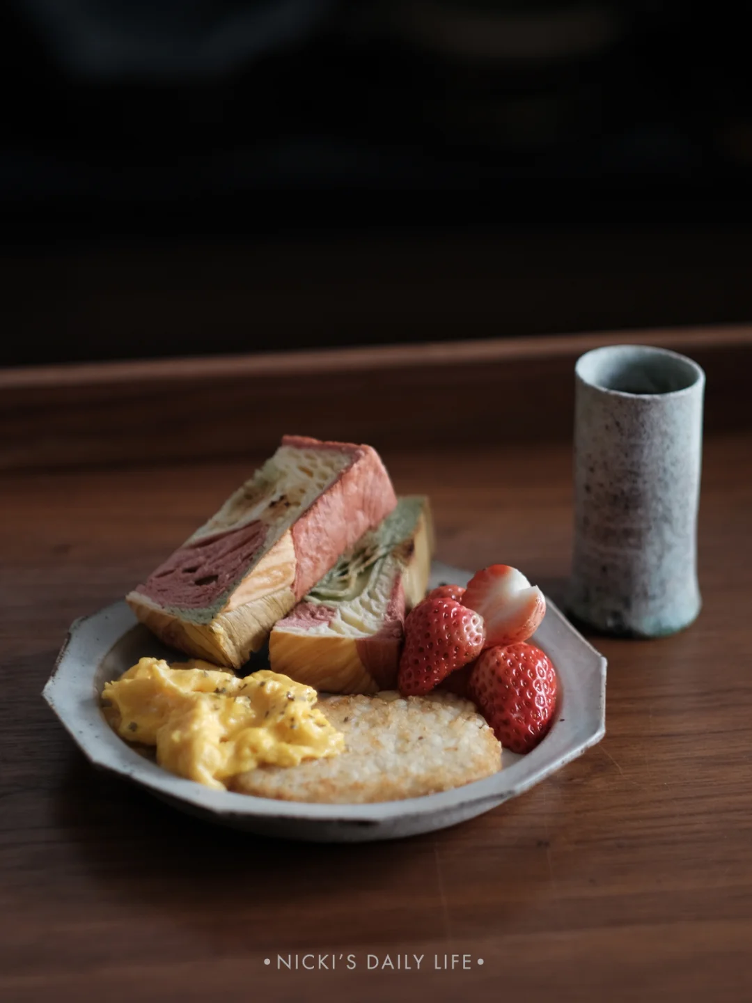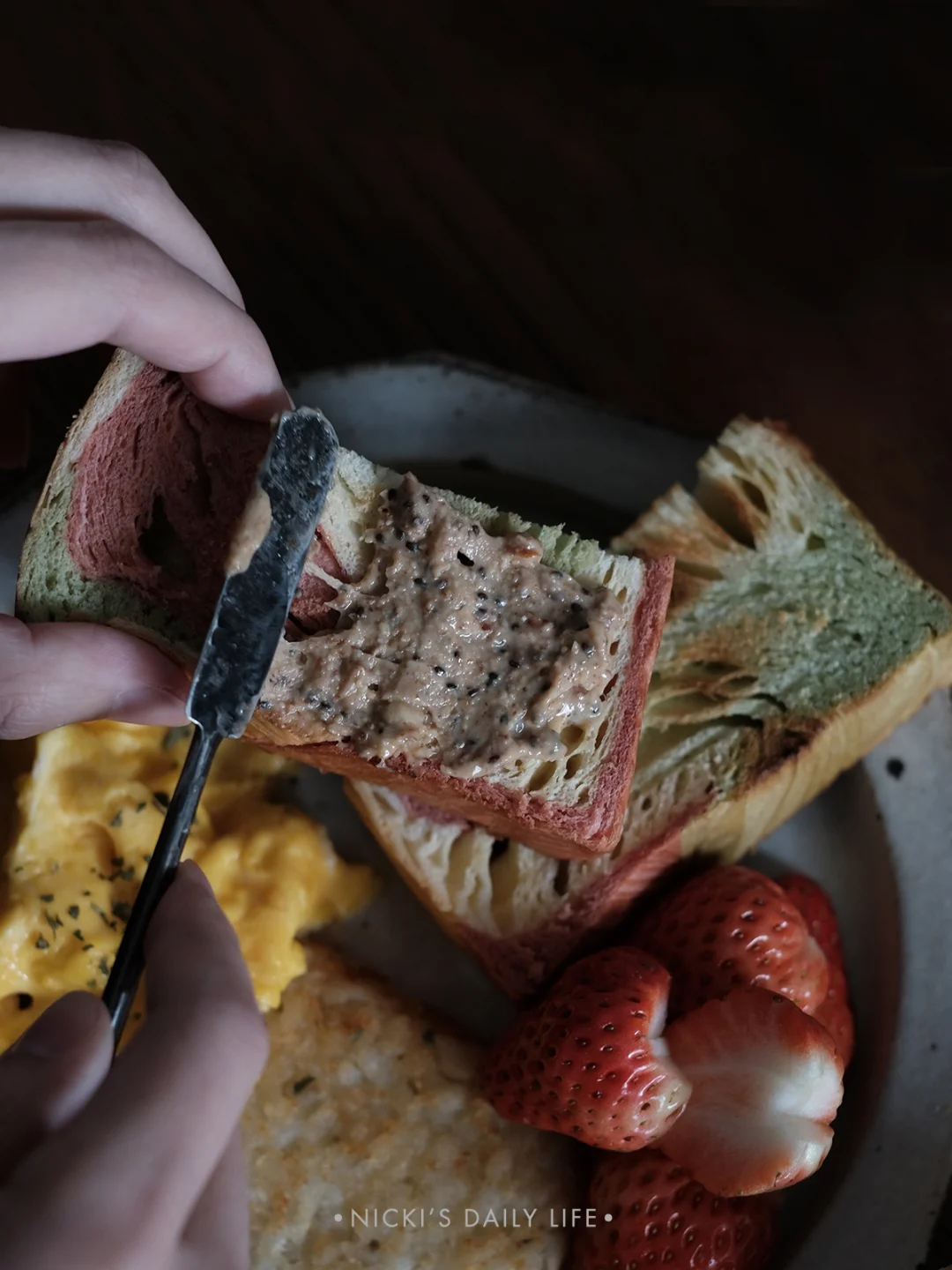 🍞早餐:吐司+坚果酱+薯饼+法式炒蛋+草莓