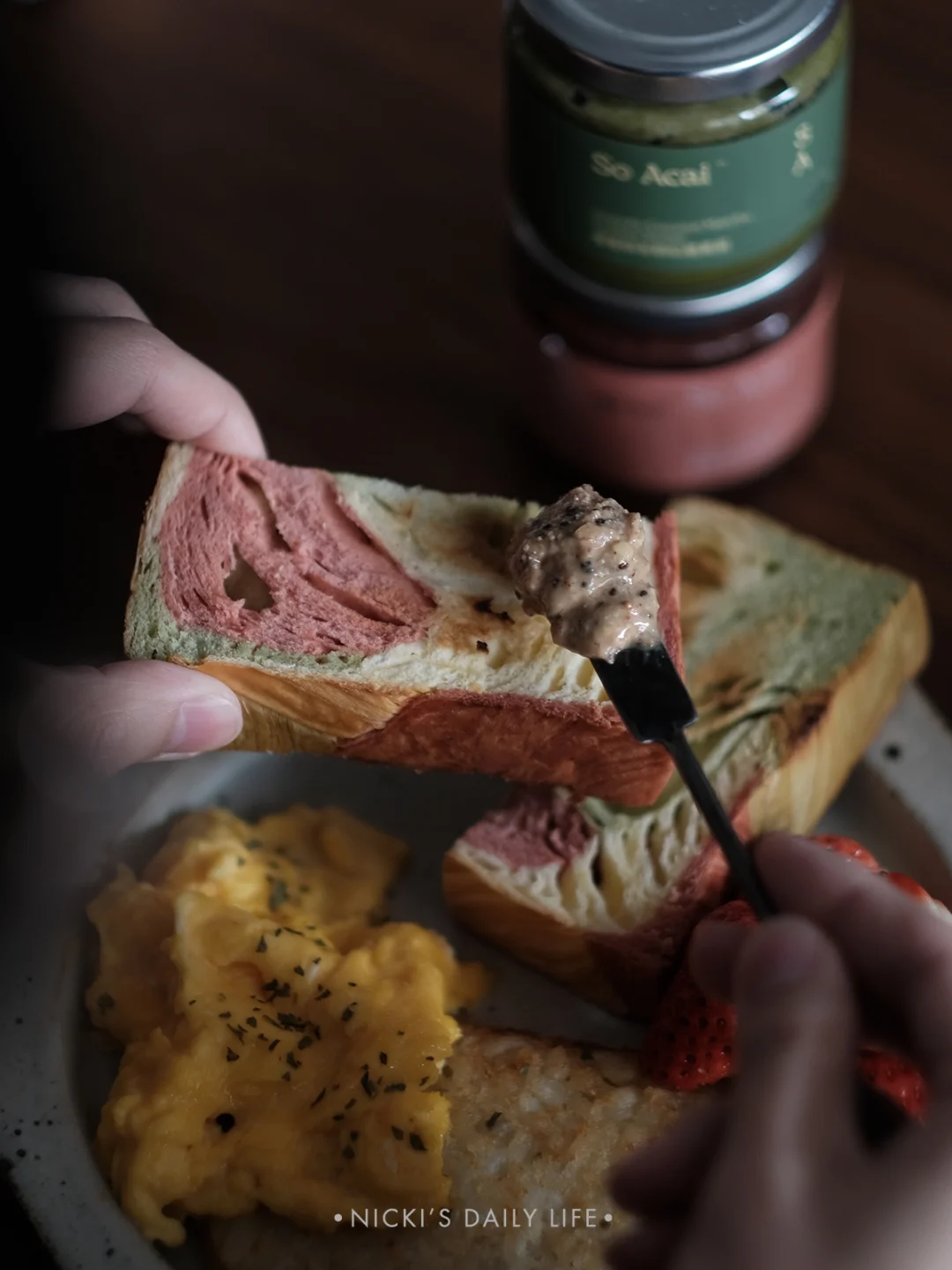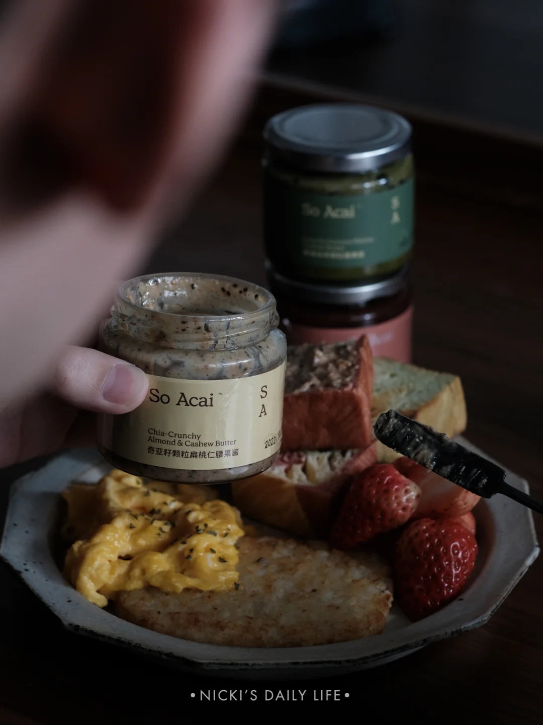 早餐其实是三餐里zui重要的一餐,面包(碳水)+鸡蛋(蛋白质)+坚果酱(适量的脂肪)+草莓(水果),营养就足够均衡。面包放进烤箱烤2分钟,涂上坚果酱,So Acai的配料表很干净,只有扁桃仁、腰果、奇亚籽,浓浓的坚果香,相比花生酱来说,这个吃多了也不会罪恶。