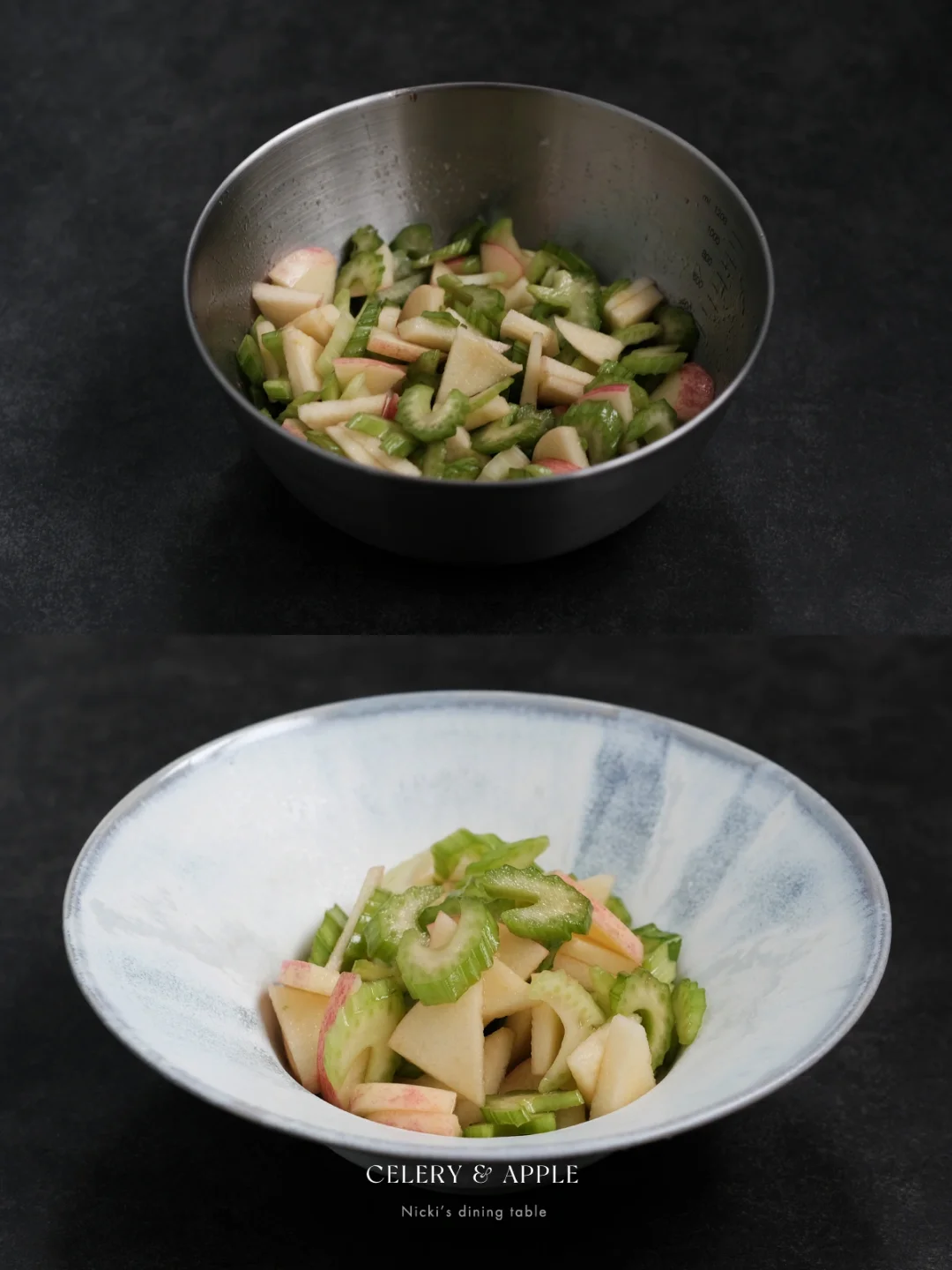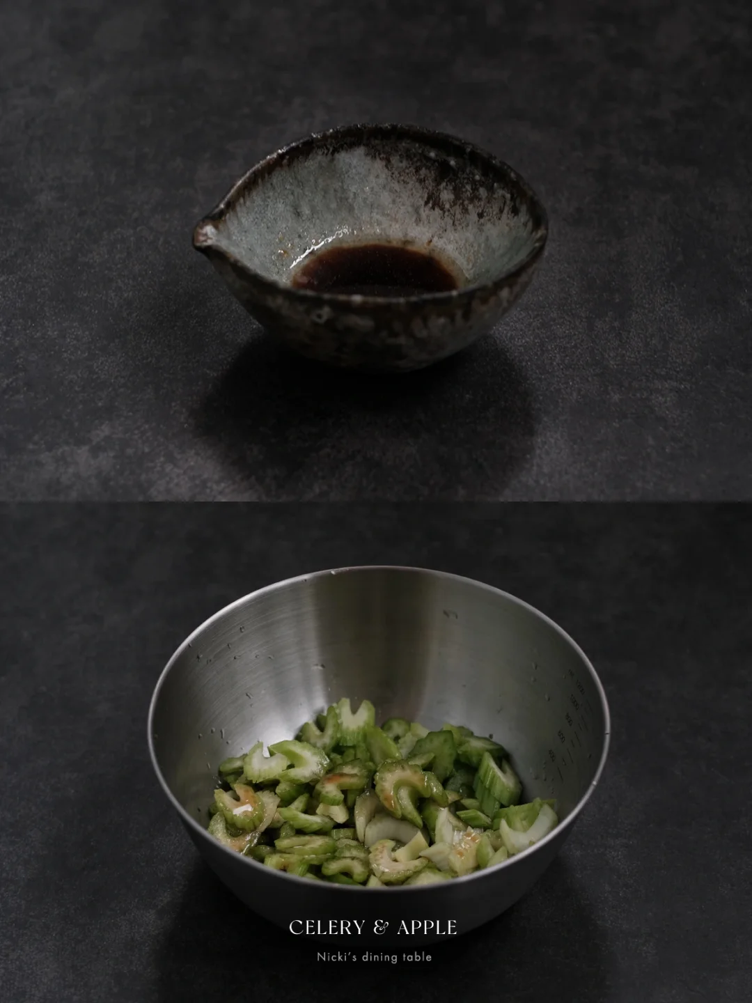 •将酱汁倒入西芹中拌匀,静止15分钟左右,再倒入苹果片拌匀即可。(西芹相对苹果来说更难入味一些,所以先调味西芹。)