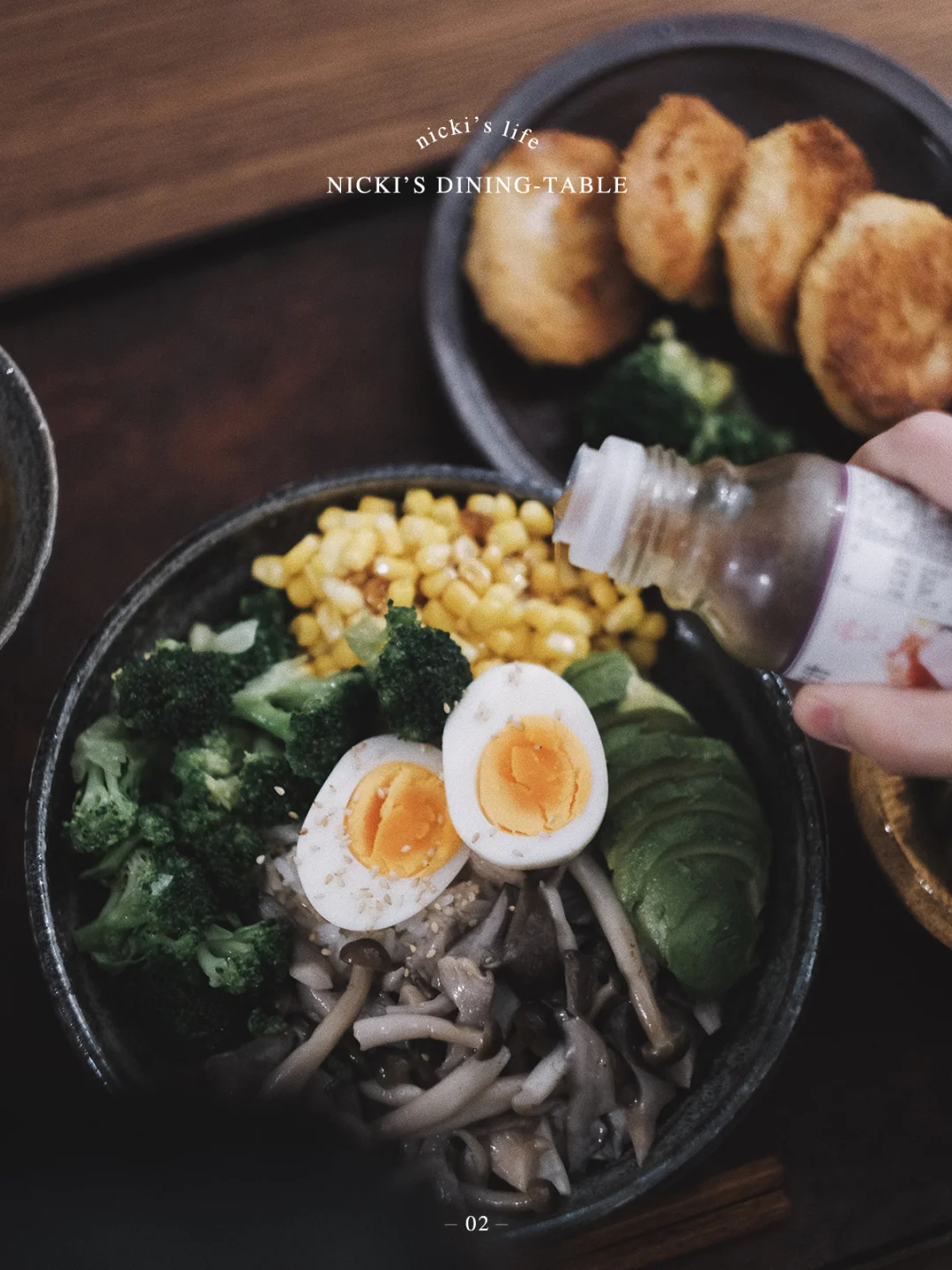 • 食材:蟹味菇,平菇,玉米,西兰花,牛油果
