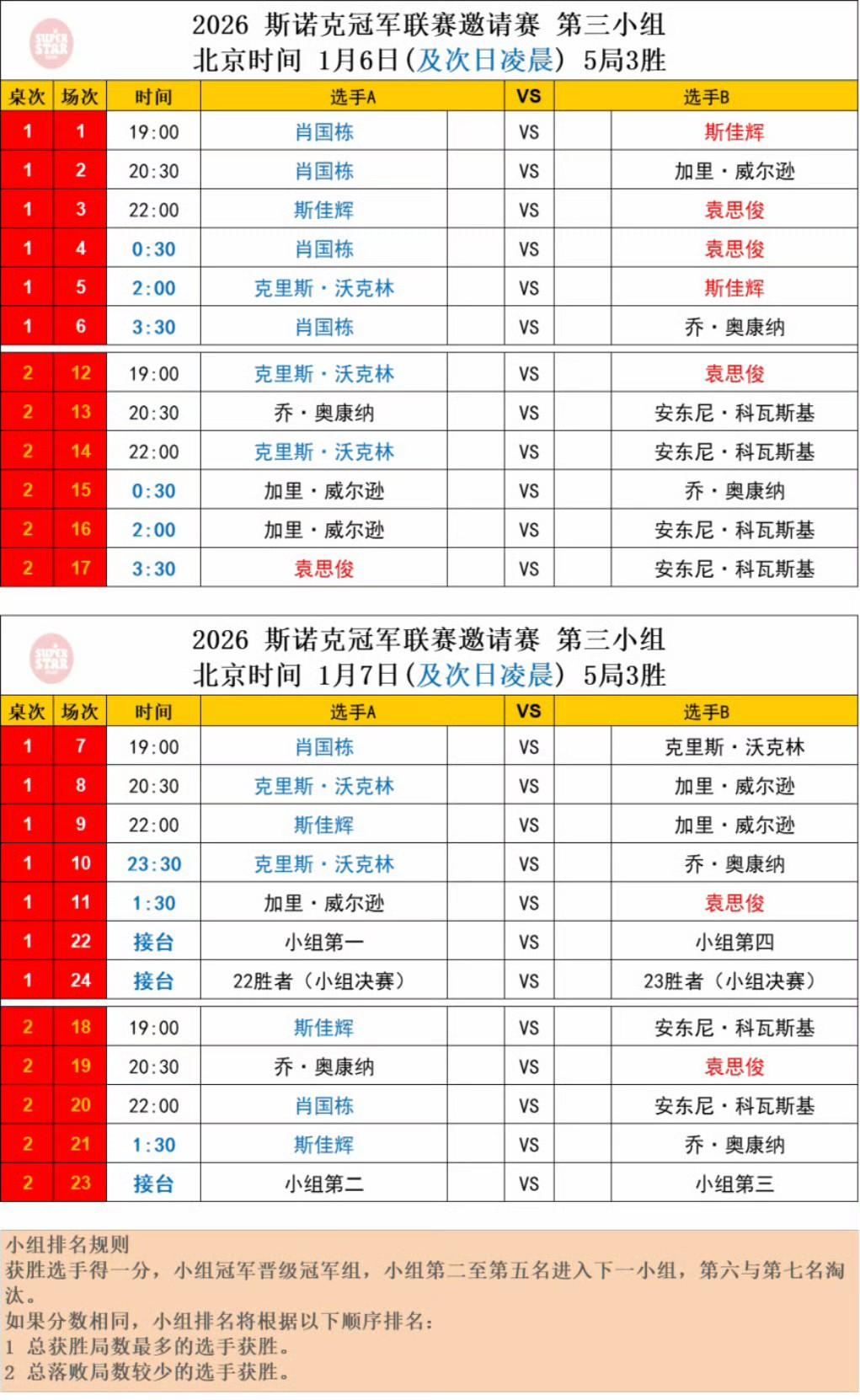 斯诺克冠军联赛第二小组决出冠军斯莱塞,韦克林、奥康纳、加里威尔逊转入第三组继续争夺冠军。 第三组有三位中国球员:肖国栋、斯佳辉、袁思俊。 冠军联赛既方便锻炼手感、又方便积累破百杆数,对于一般球员何乐而不为!