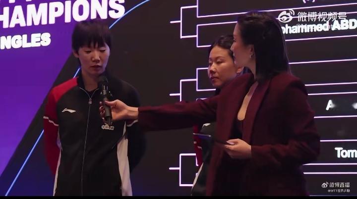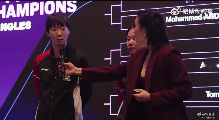 抽签仪式上的王曼昱[赞]! 2026WTT多哈冠军赛抽签仪式上王曼昱接受了现场采访。 这个采访是在抽签刚刚结束时,主持人问曼昱在这新赛季首战里最期待打出怎样的表现。 曼昱谦虚地说,每一场的对手都非常强大,特别是第一场,希望自己能在这开年大赛中有一个好的发挥。 确实,本站曼昱首轮对阵大藤沙月,之前两个人还从未有过交手,之前每次分在一个区的时候,以为大藤沙月能够着曼昱的,结果每次她都提前走人了,这次好了,第一轮就碰到了。 曼昱加油!曼昱必胜[奋斗]!