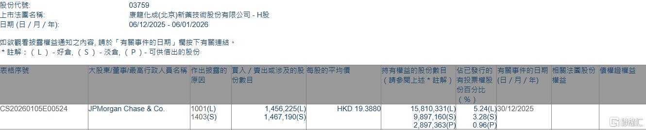 格隆汇1月6日丨根据联交所最新权益披露资料显示,2025年12月30日,康龙化成(03759.HK)获JPMorganChase&Co.以每股均价19.388港元增持好仓145.62万股,涉资约2823.33万港元。