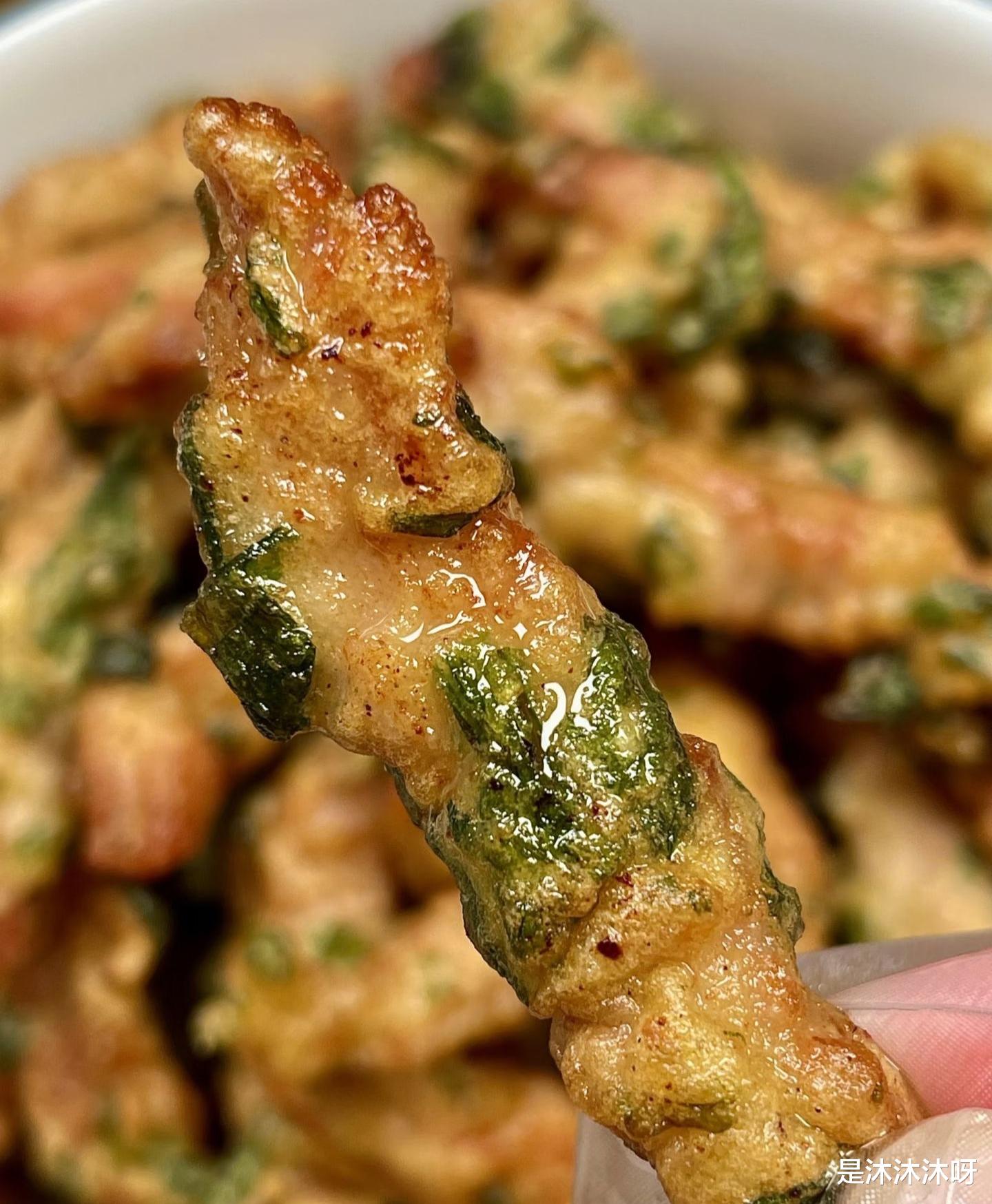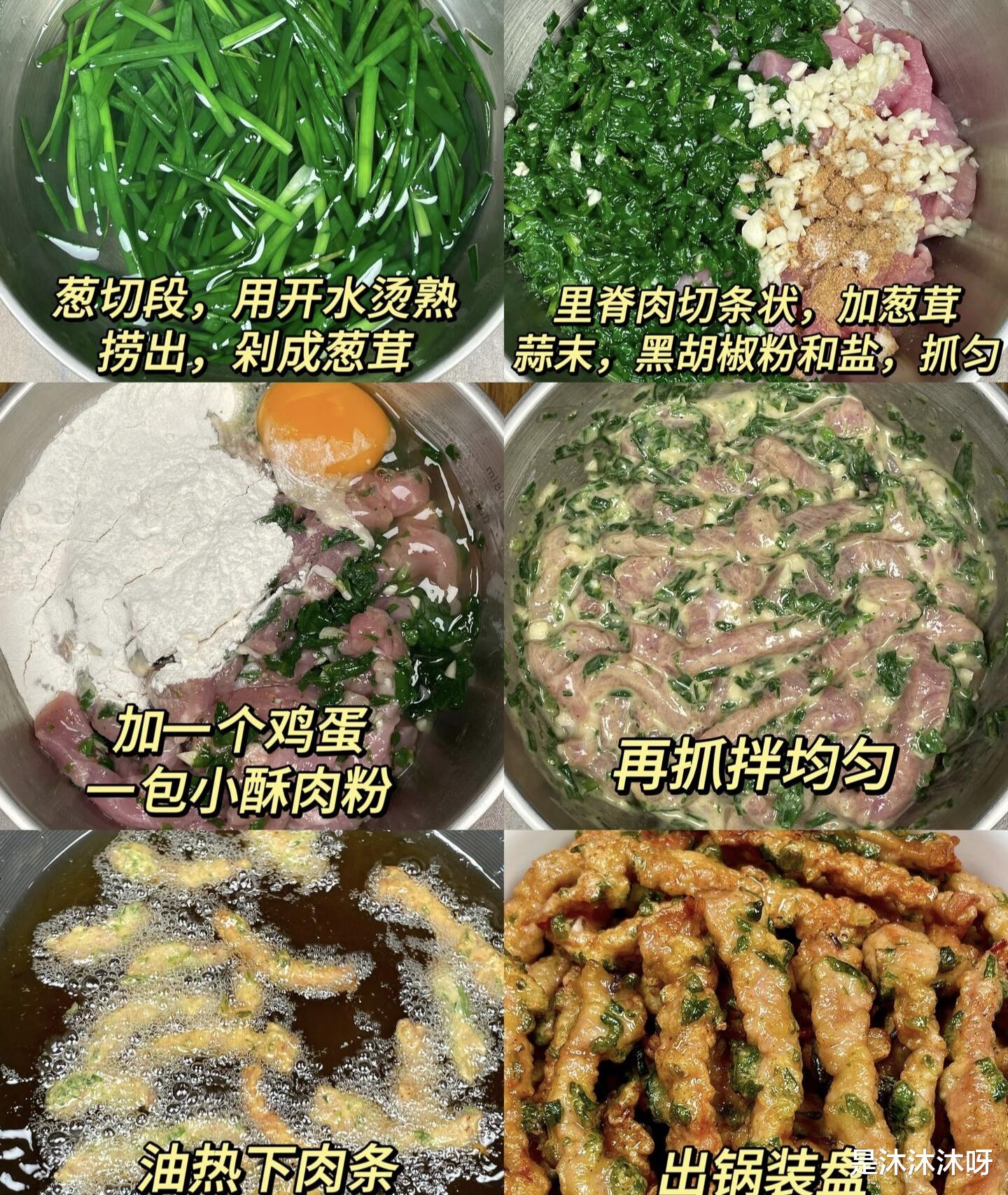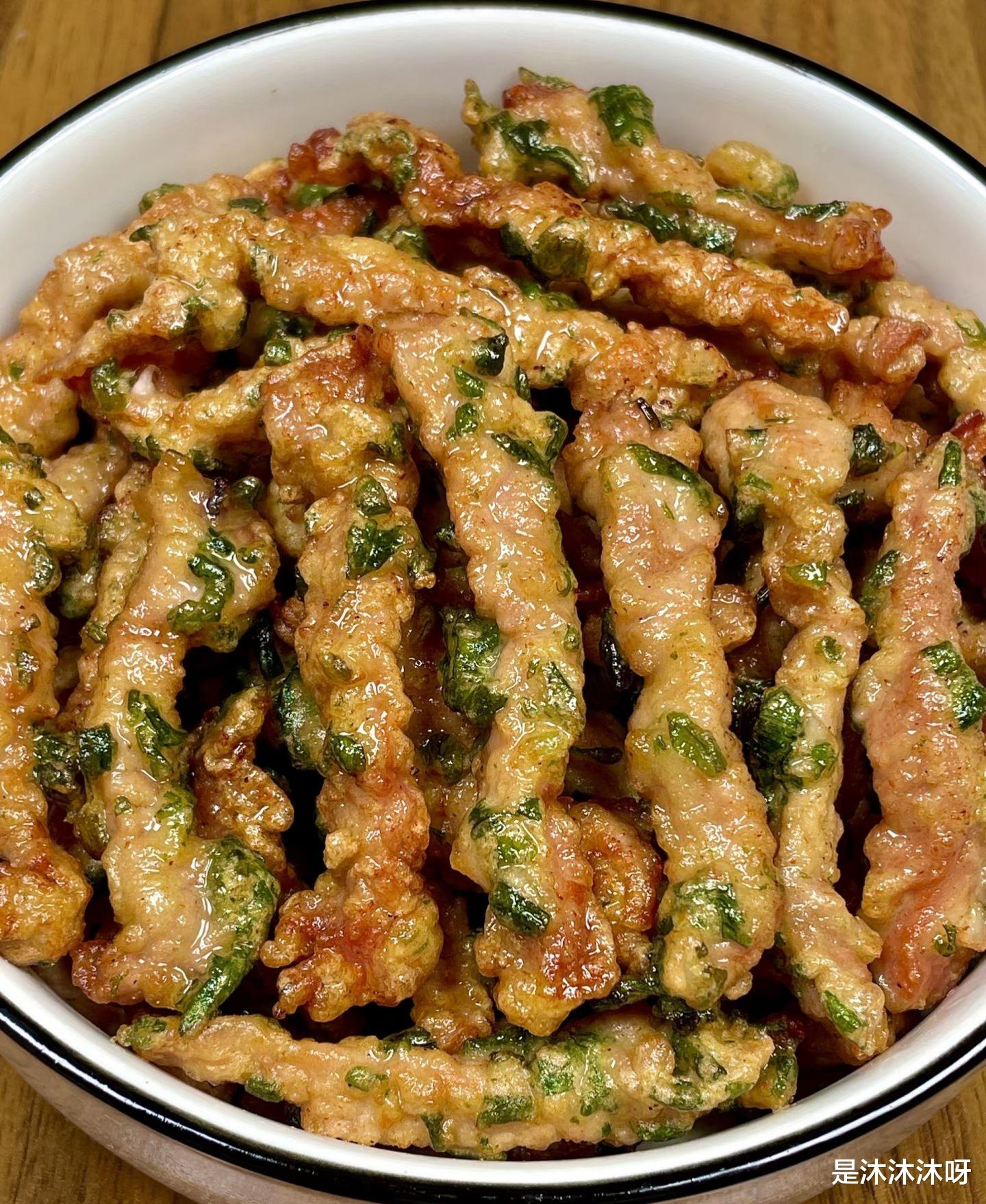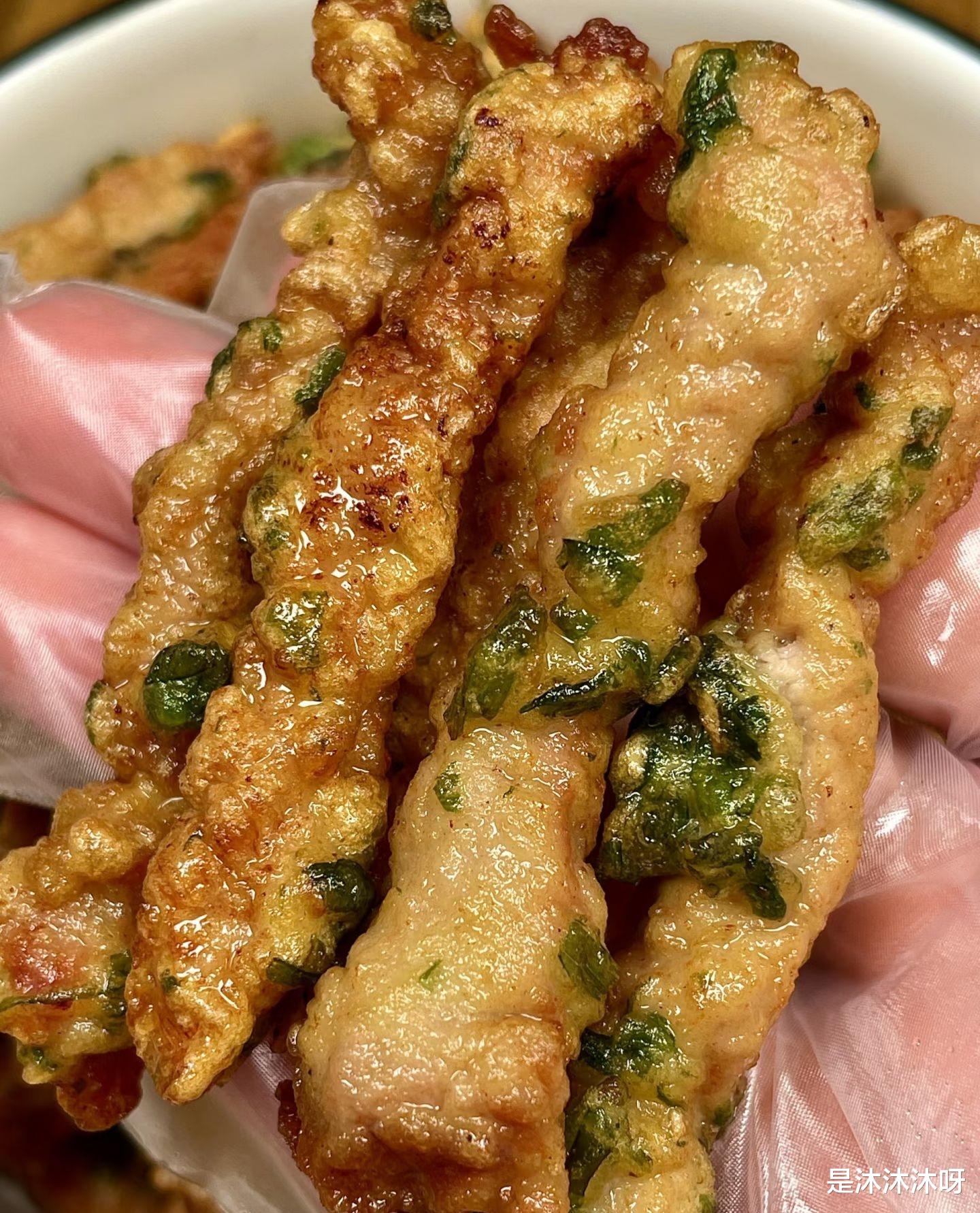 把腌制好的肉条倒进糊里,再加入切碎的葱白,抓拌均匀,让每根肉条都穿上金黄色的“外衣”,像是给它们裹上了一层厚厚的雪。