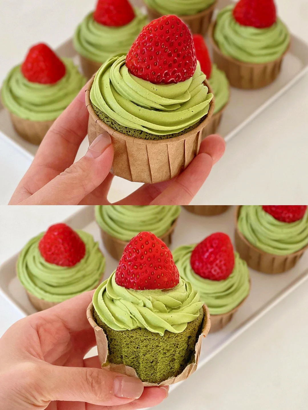 圣诞节还有一个月就要到啦,给大家分享纸杯蛋糕啦,简单又好看,姐妹们安排起来 食材🧑‍🍳: 鸡蛋3个、草莓适量、低筋面粉55克、抹茶8克、细砂糖50克(蛋白霜30克十奶油20克)牛奶75毫升、玉米油30克、淡奶油200毫升 🥚蛋清打发 1、蛋清一定要放在无油无水的盆里!可以放冰箱冷冻 15分钟再打发,更稳定,但是不放也可以的 2、打发时间我计算了一下从打发大鱼泡开始到结束大概 2分钟30秒,就差不多了,最后的状态就是奶油质地,很光滑很细腻 3、打发最后一次把打蛋器倾斜沿着边去打发,这样更彻底,打的也会更好 🧑‍🍳制作步骤 1、翻拌蛋黄糊的时候一定要z型手法 2、翻拌蛋黄糊和蛋白霜的时候控制在30秒以内,不然容易消泡 3、烤箱温度110~120度烤40分钟,然后转150度烤8~10分钟 8~10分,最后一定要观察,我的烤箱120度40分钟就差不多了,一定要中下层!还有温度尽量低烤久一些再转,就基本不会塌陷!! 4、烤出来之前闷5分钟,然后拿出来轻震一下也会更好,倒扣过来,不过如果趁热倒扣表面会有痕迹,可以垫油纸哈 5、白砂糖大家也可以根据自己口味调节哈,最后挤在纸杯蛋糕上,然后可以装饰各种水果啦